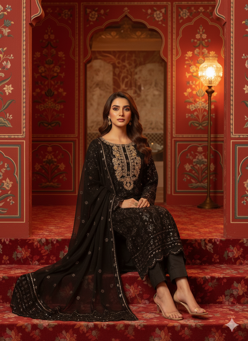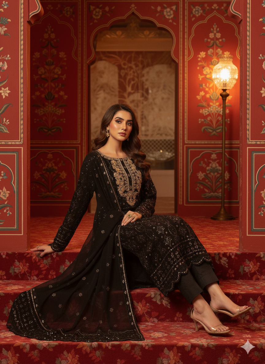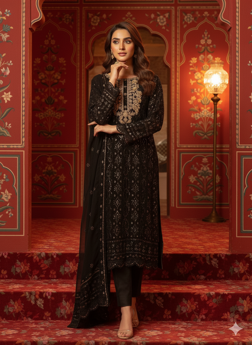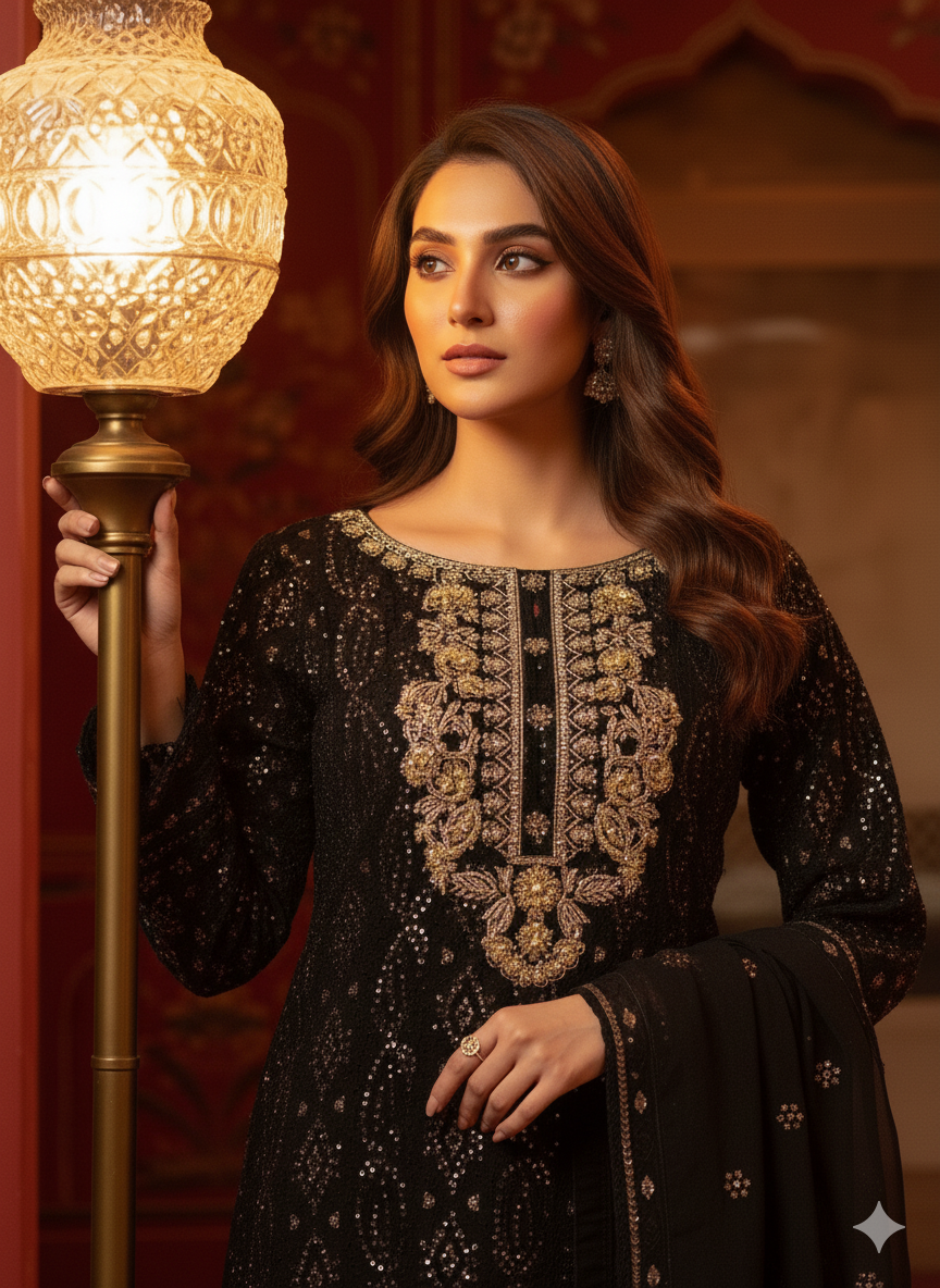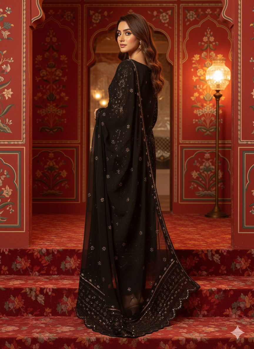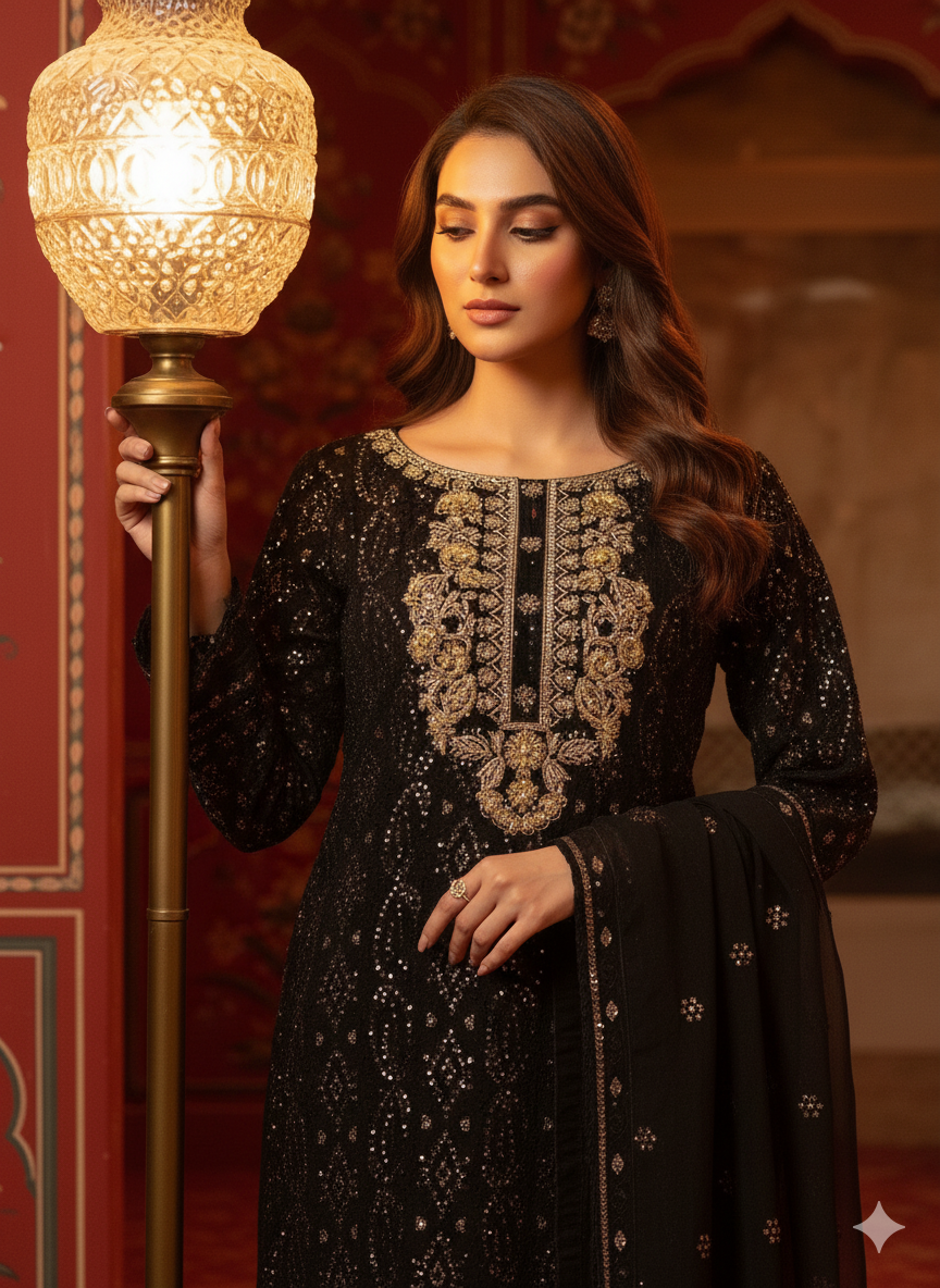 This elegant dress is crafted from premium chiffon fabric featuring intricate chikan kari embroidery adorned with sequins work. The handmade neckline is embellished with dapka, cora, pearls, moti, and sitara for a luxurious finish.