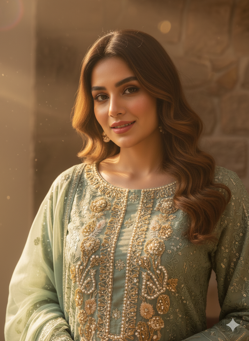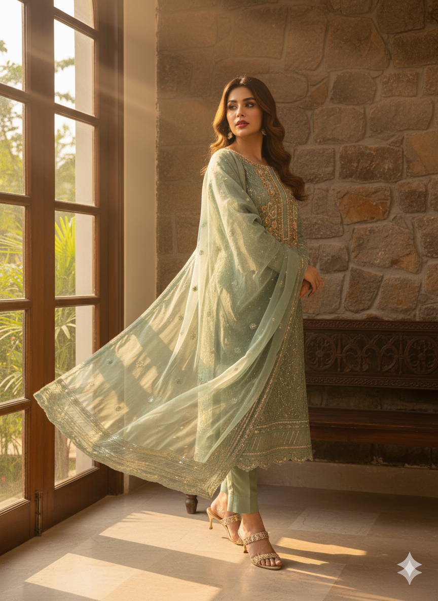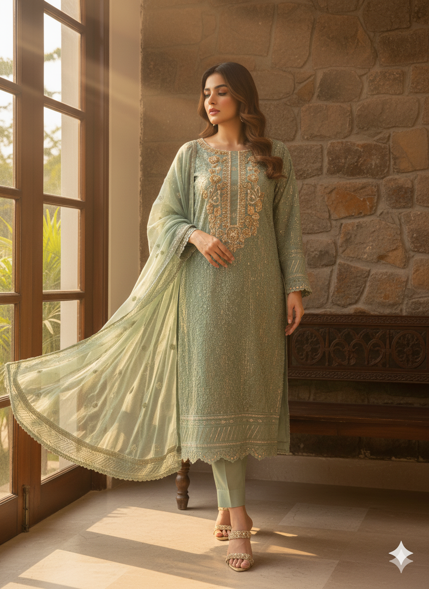 This elegant dress is crafted from premium chiffon fabric featuring intricate chikan kari embroidery adorned with sequins work. The handmade neckline is embellished with dapka, cora, pearls, moti, and sitara for a luxurious finish.