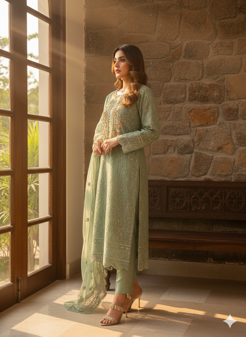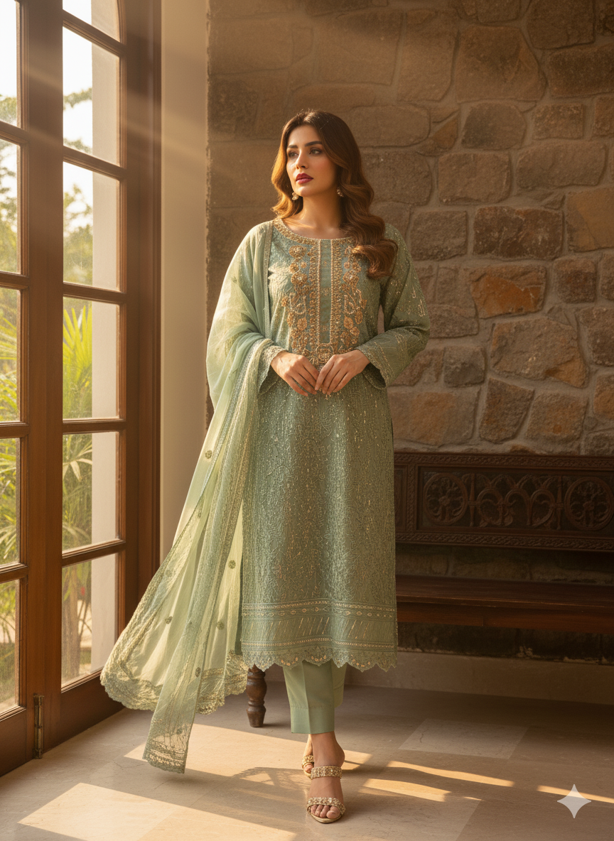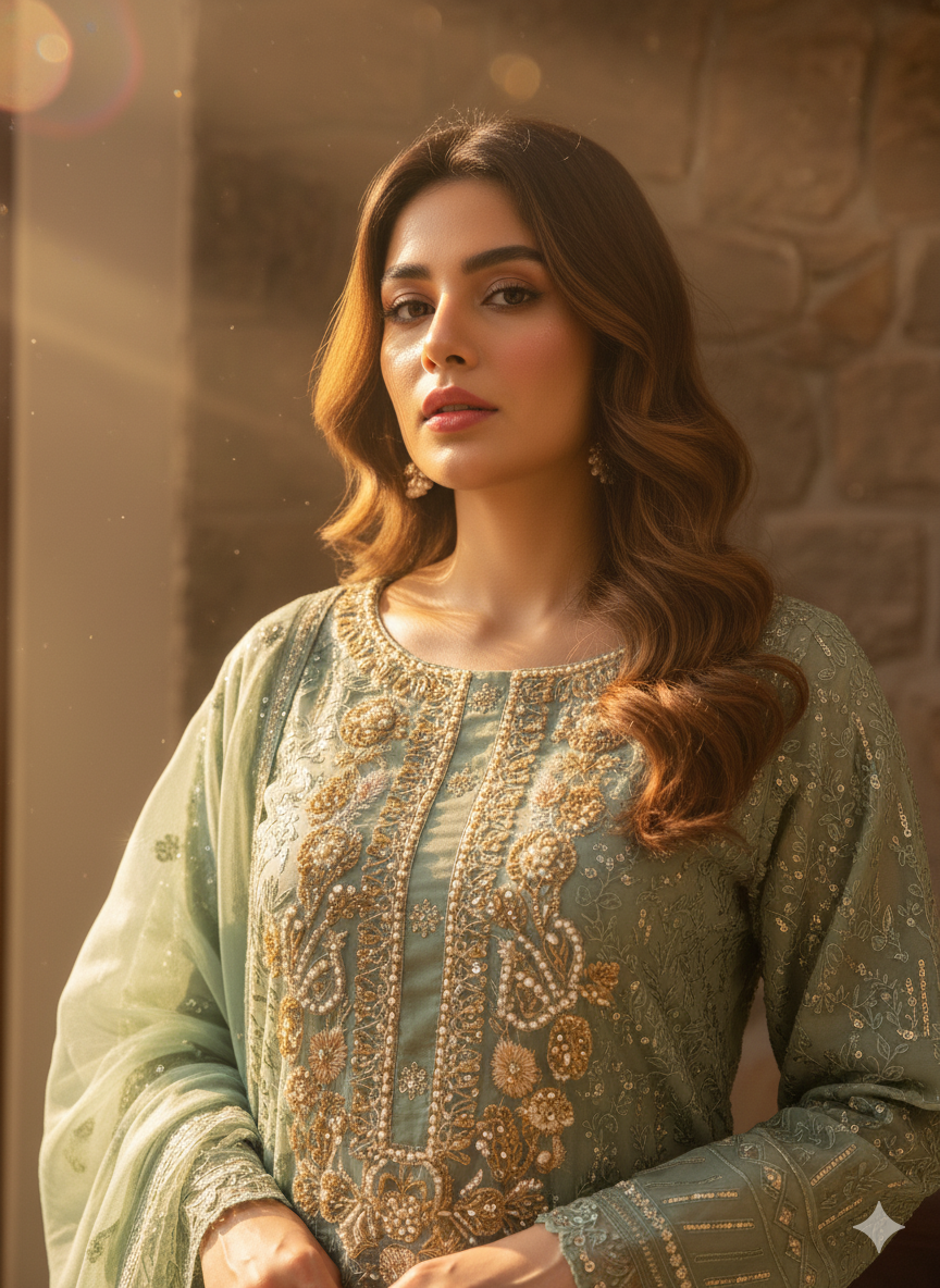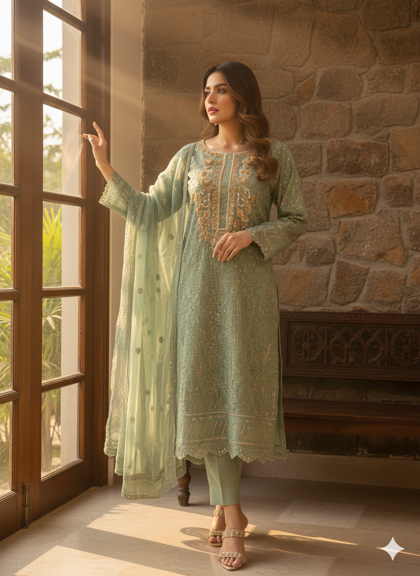 The dupatta, also made of chiffon, is beautifully bordered with full embroidery, adding a graceful touch to the ensemble.