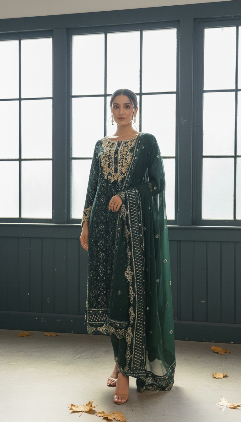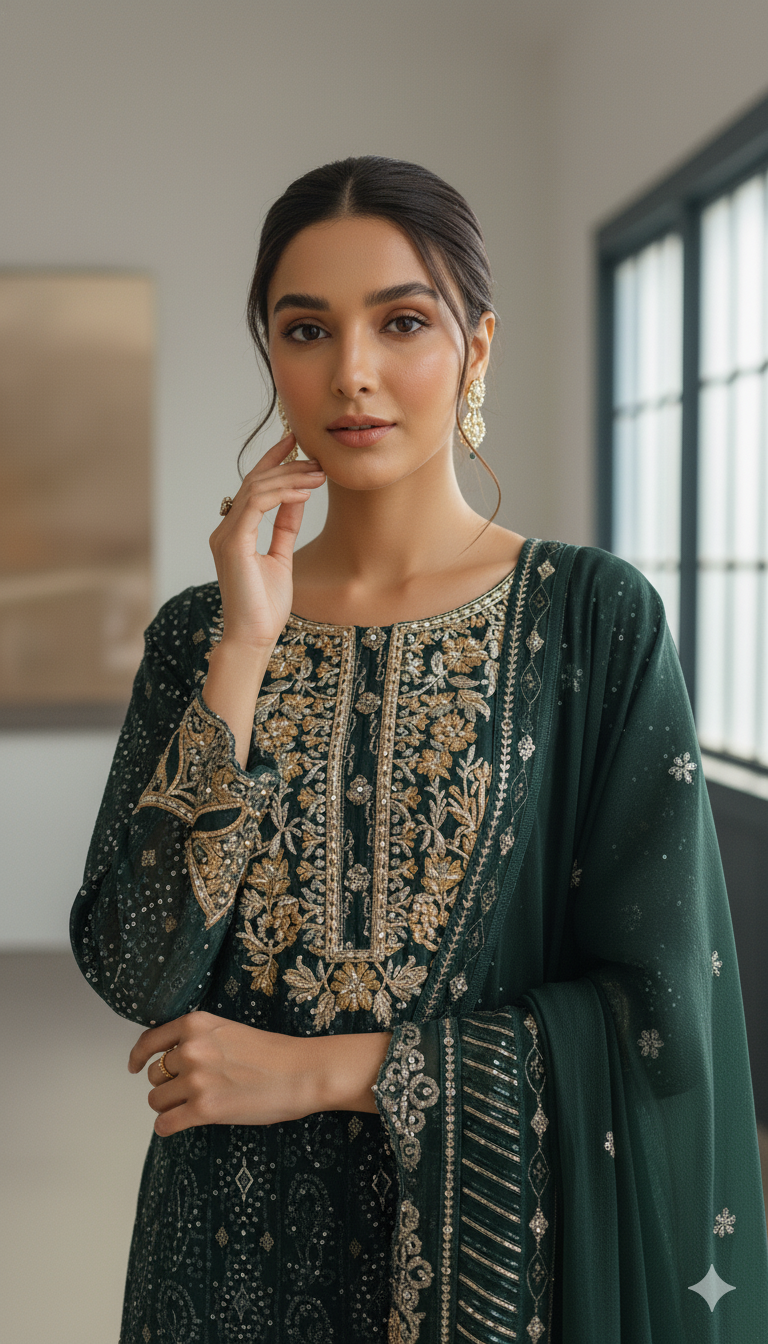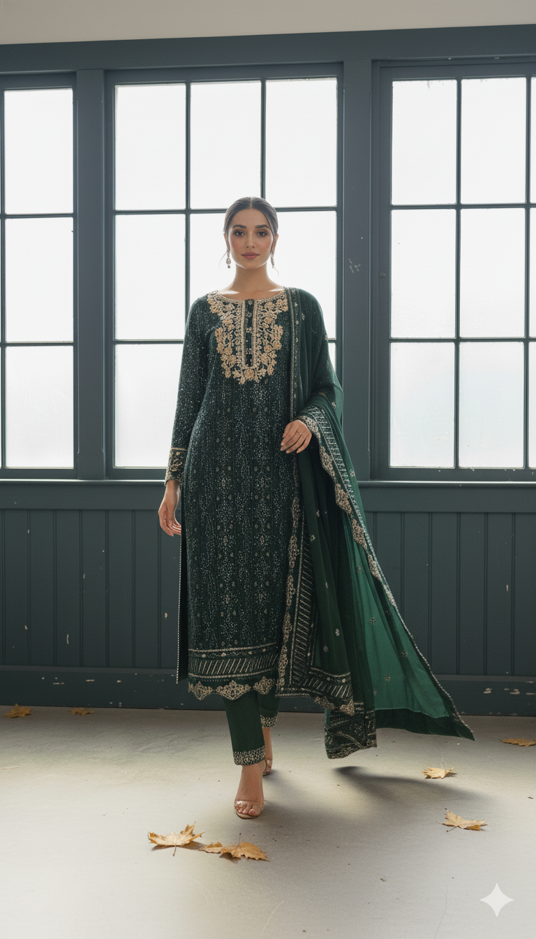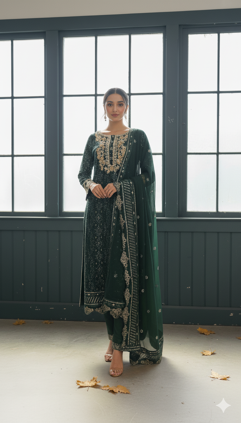 The dupatta, also made of chiffon, is beautifully bordered with full embroidery, adding a graceful touch to the ensemble.