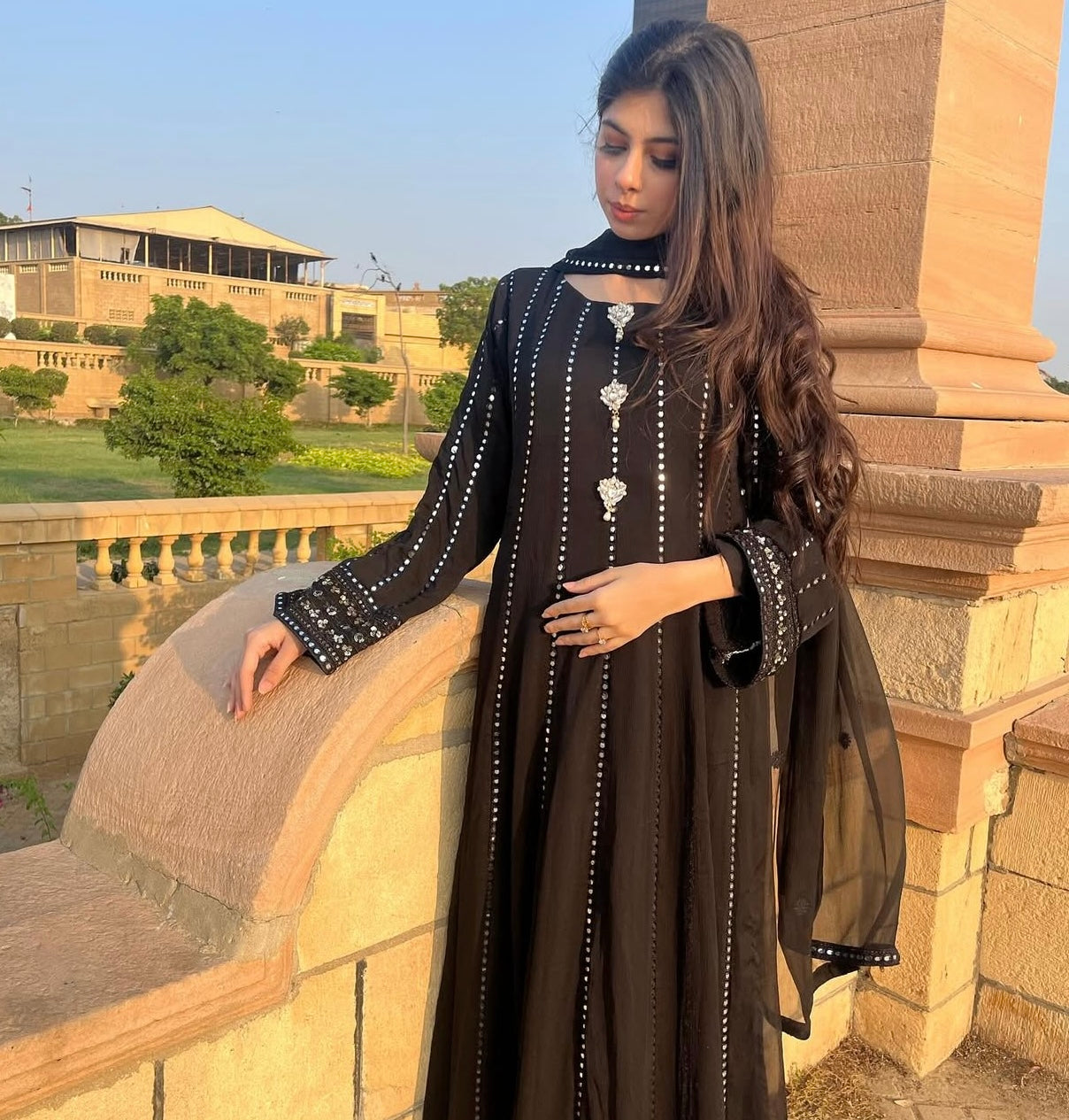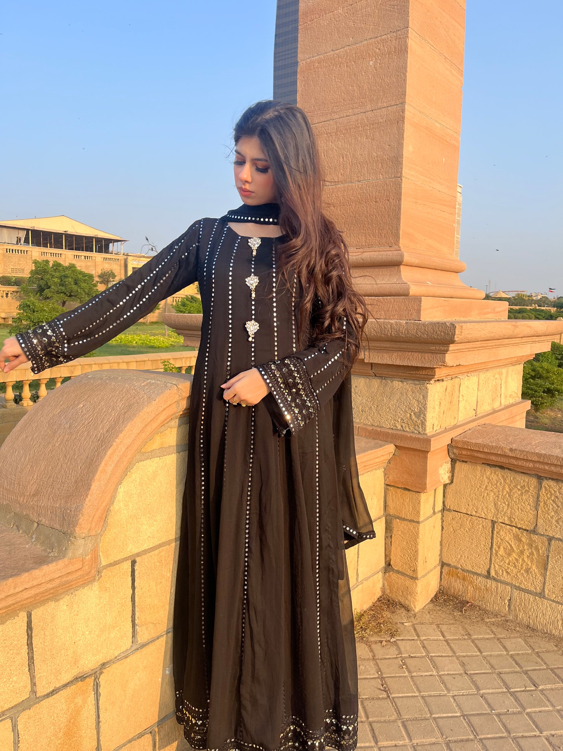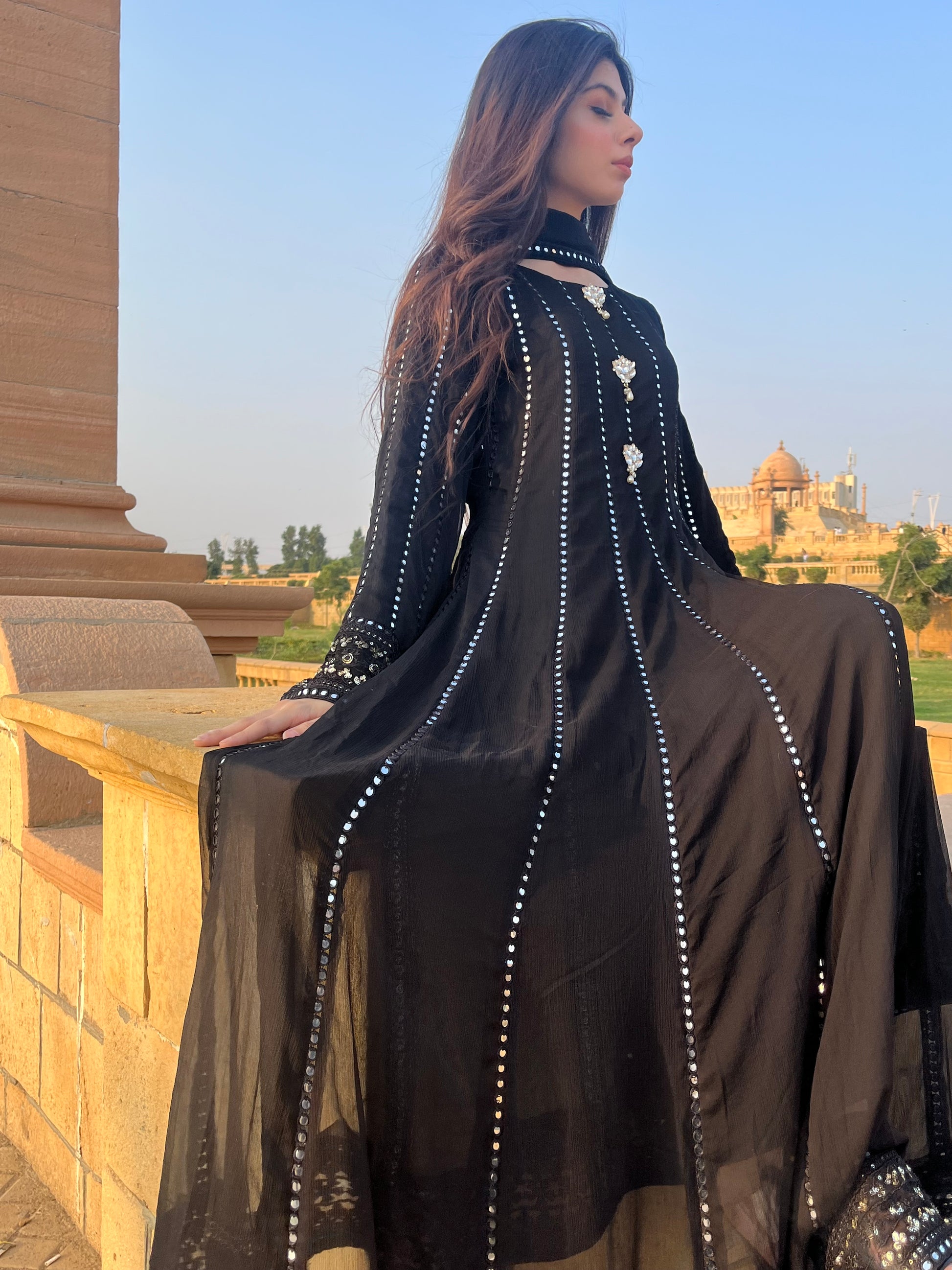 This outfit features premium crinkle chiffon fabric adorned with intricate 9mm embroidery work on panels and borders. The design is enhanced with delicate thread and sequin embroidery for a luxurious touch.