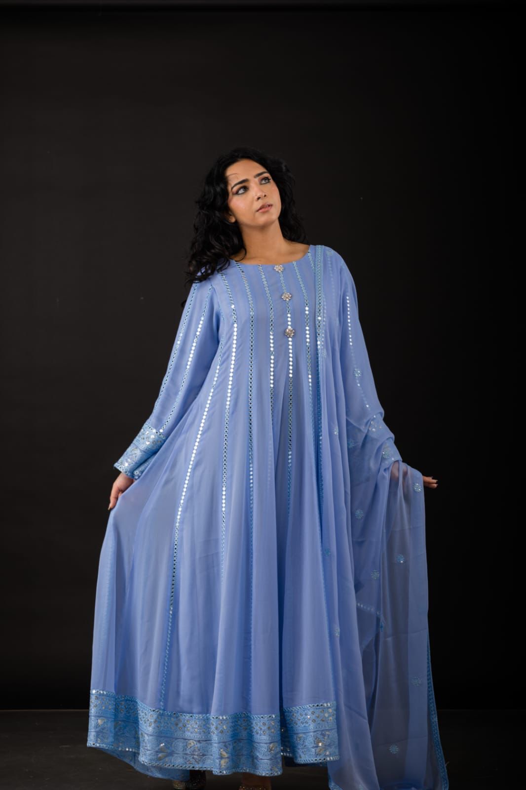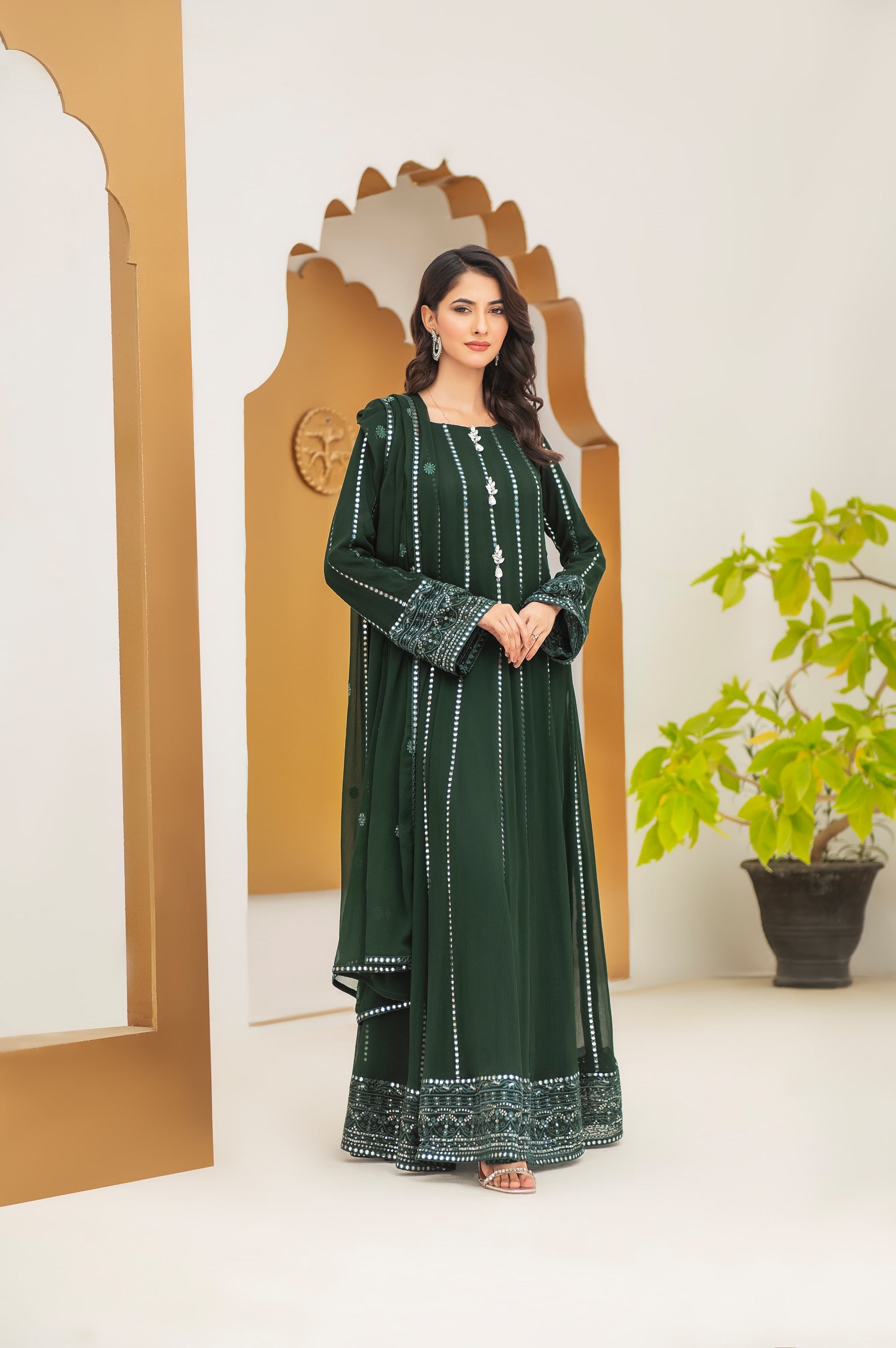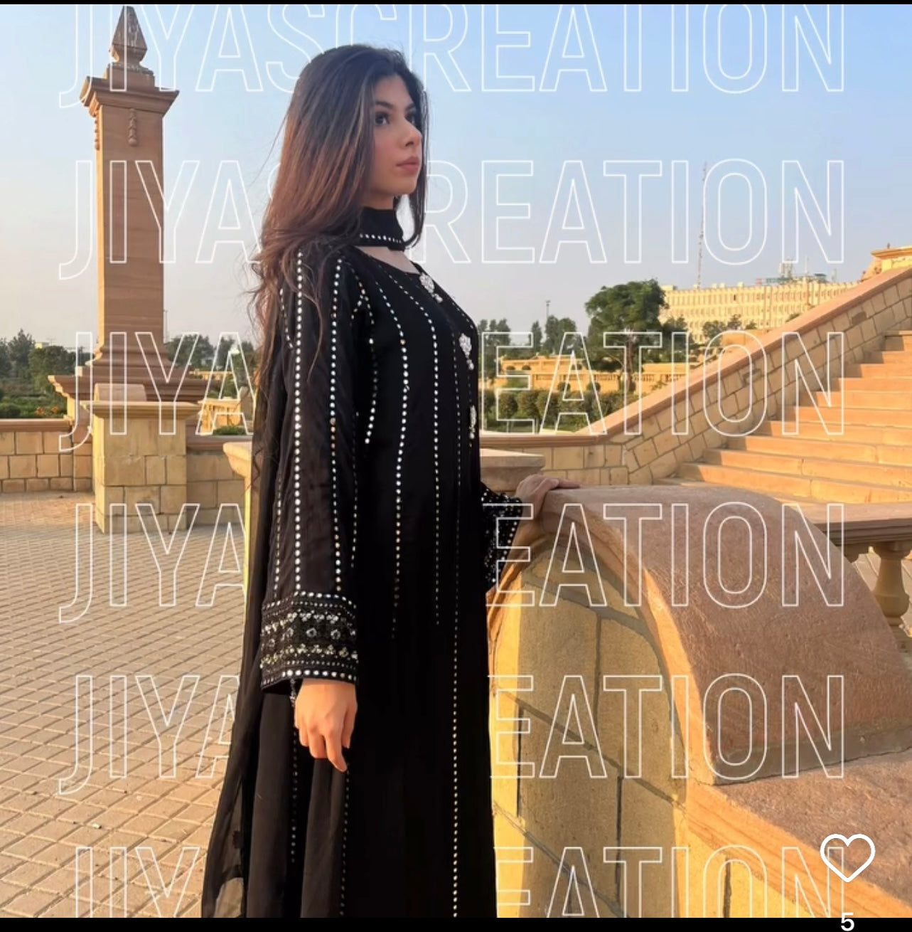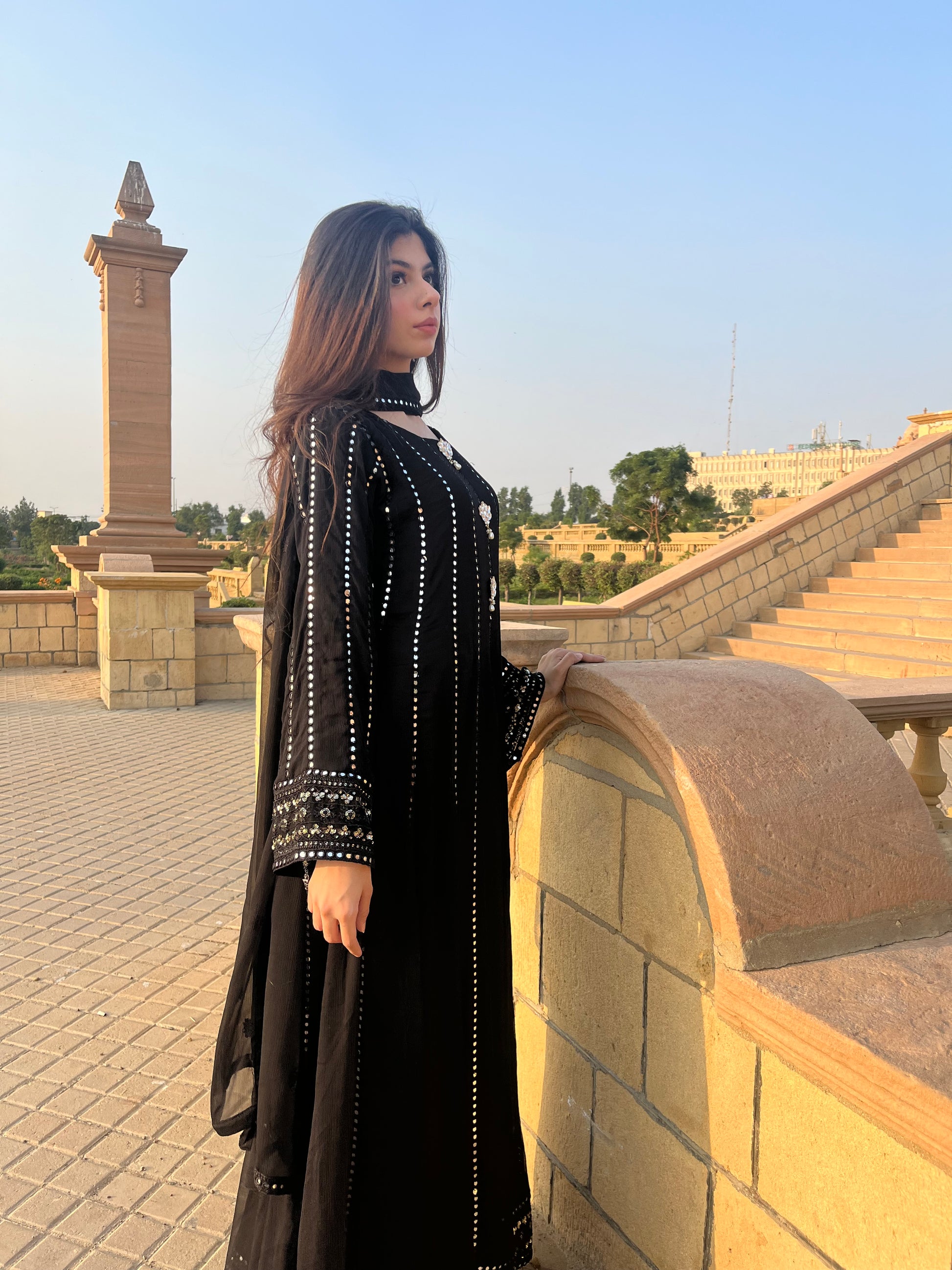 This outfit features premium crinkle chiffon fabric adorned with intricate 9mm embroidery work on panels and borders. The design is enhanced with delicate thread and sequin embroidery for a luxurious touch.