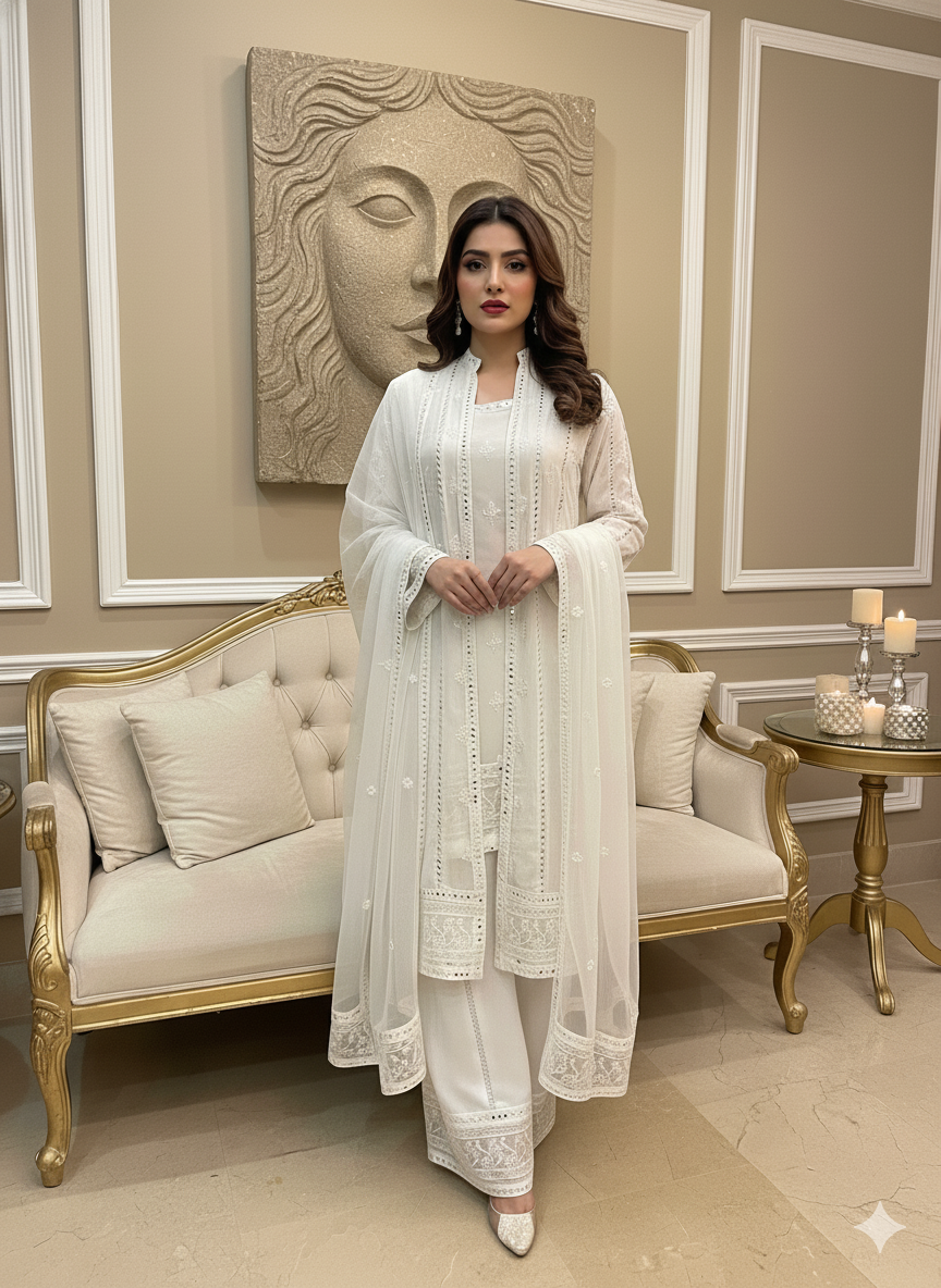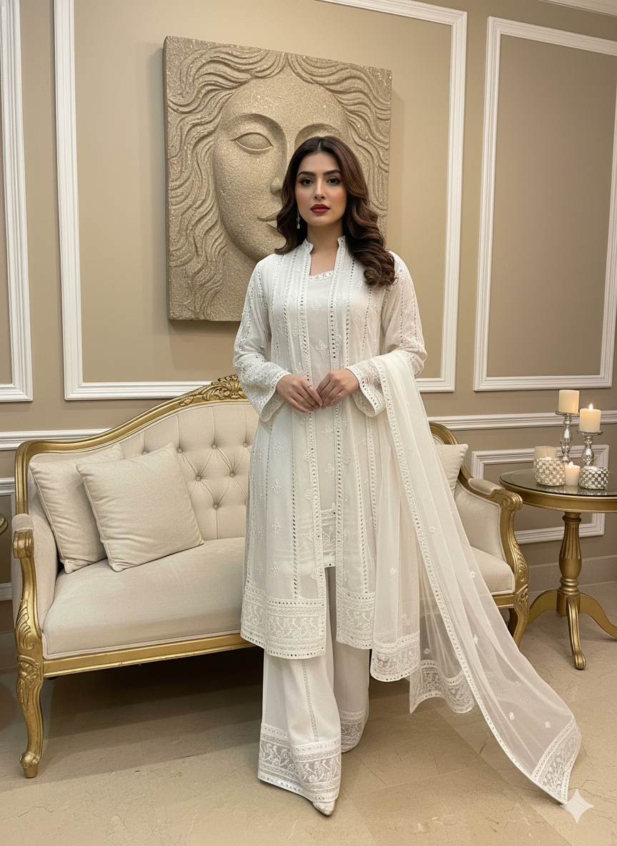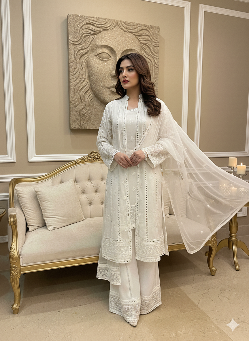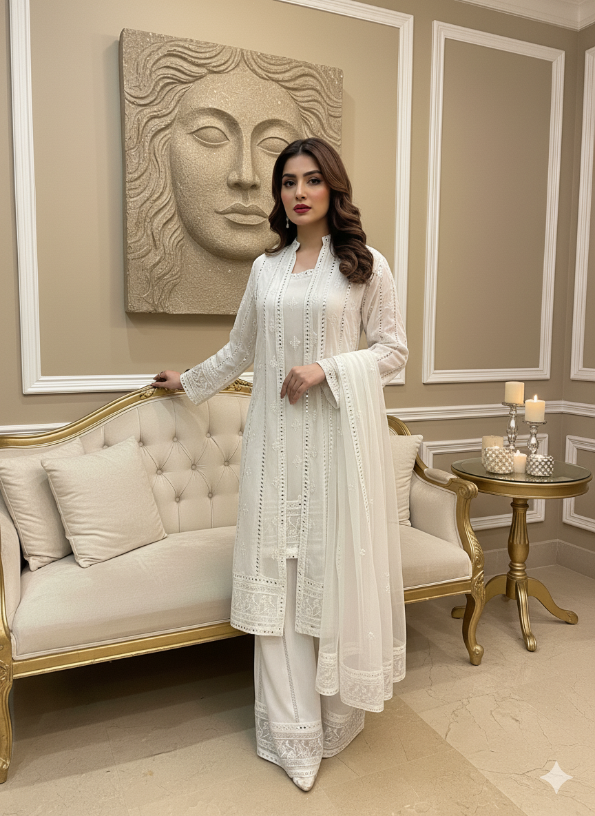 The dupatta showcases delicate boti embroidery with a heavy embroidered border along the edges, adding a touch of sophistication. This outfit is a perfect blend of elegance and luxury — ideal for festive occasions, parties, and formal wear.