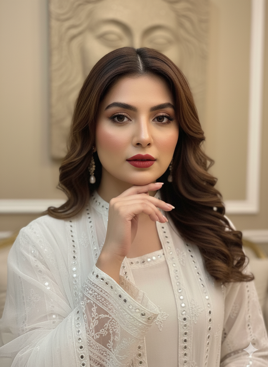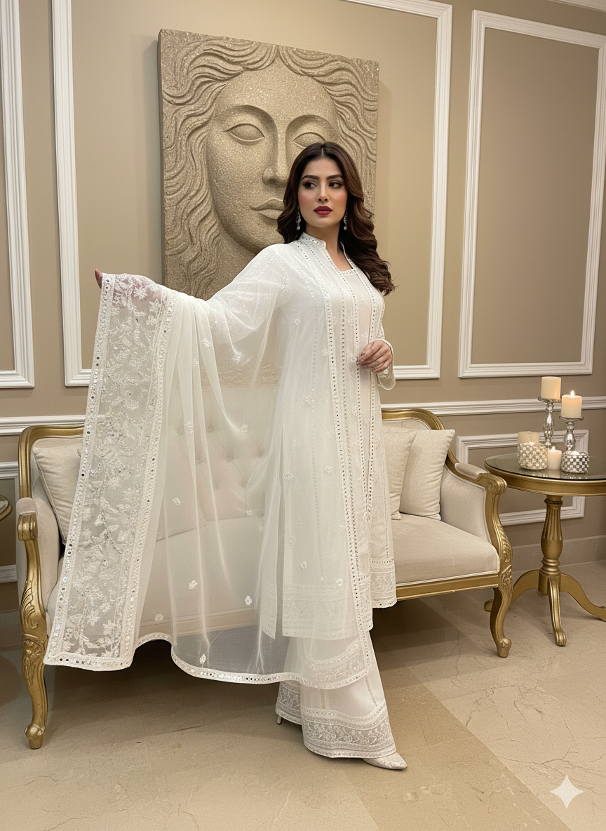 This elegant ensemble is crafted from premium chiffon fabric, intricately embroidered with fine thread and sequins. The gown features 9mm sequin embellishments on the front, back, and sleeves, enhanced with detailed threadwork for a luxurious finish. The accompanying Dhaka pants are also adorned with 9mm sequins, complementing the gown’s rich design.