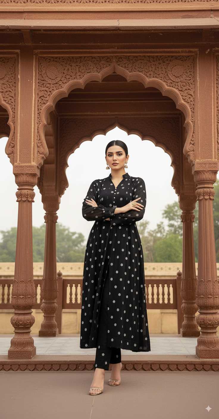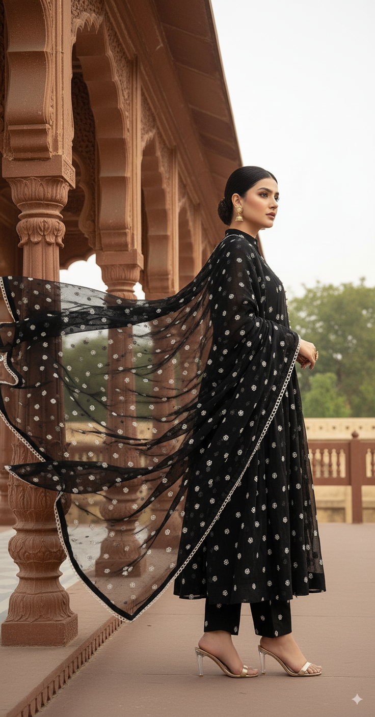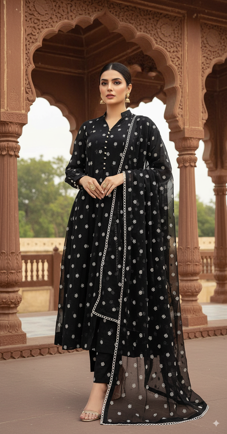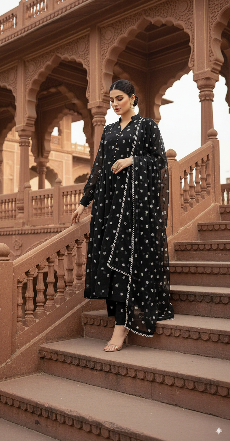Chiffon:fabric front open maxi 3piece.Thread work only.