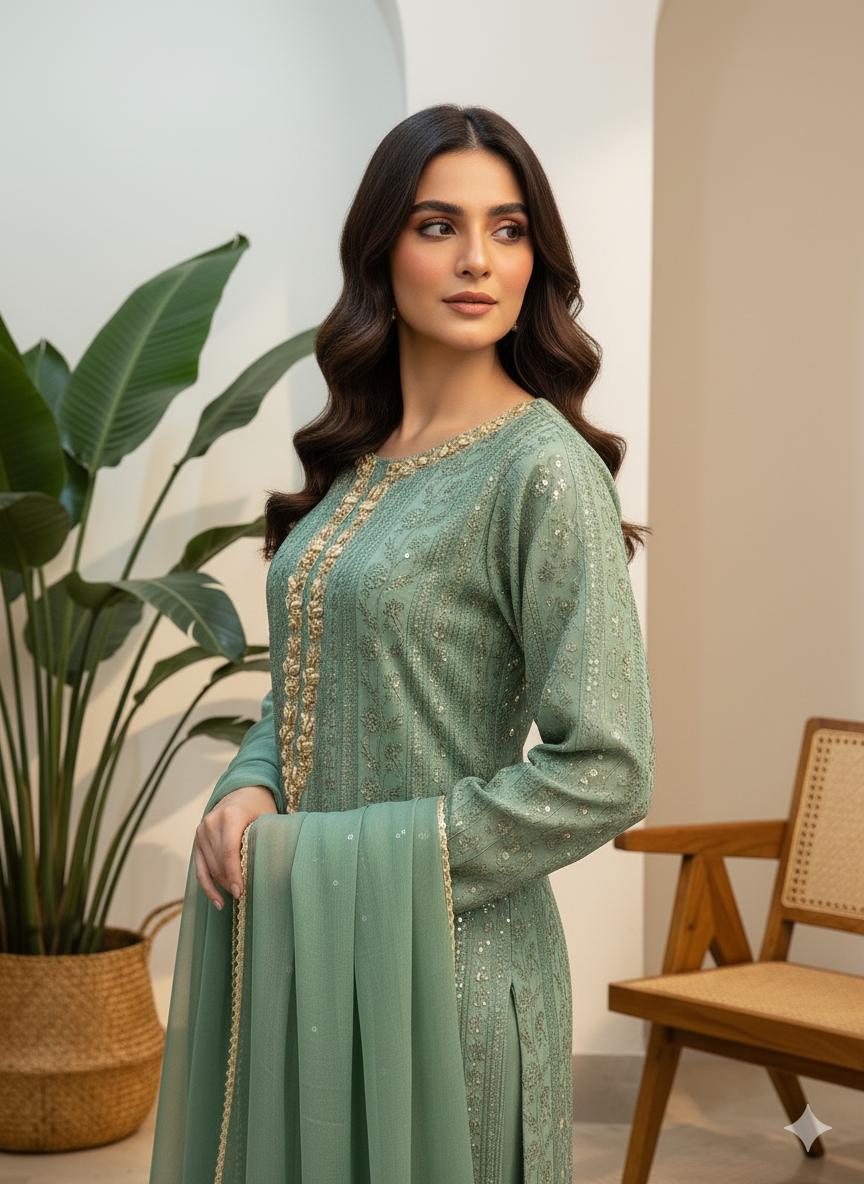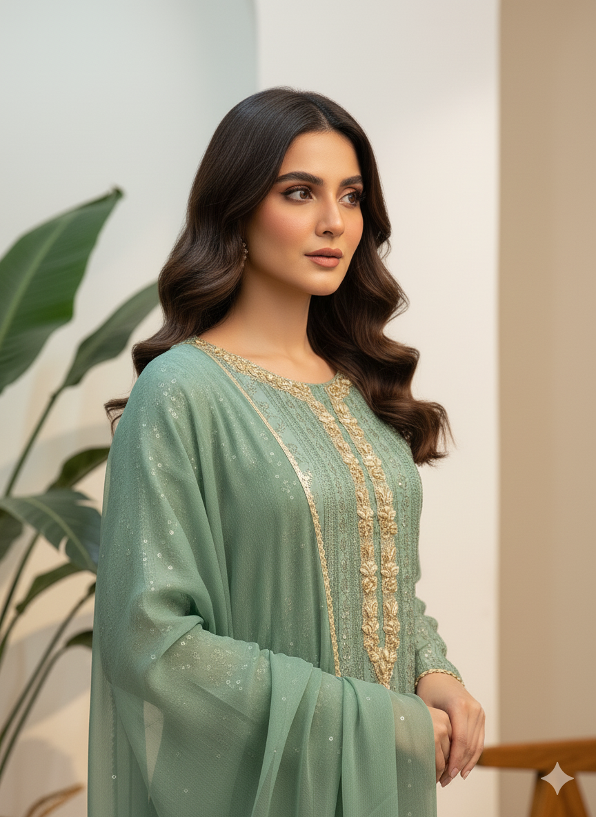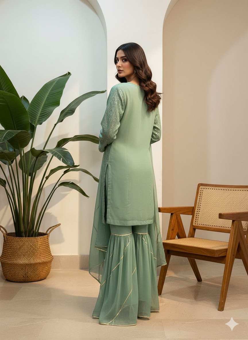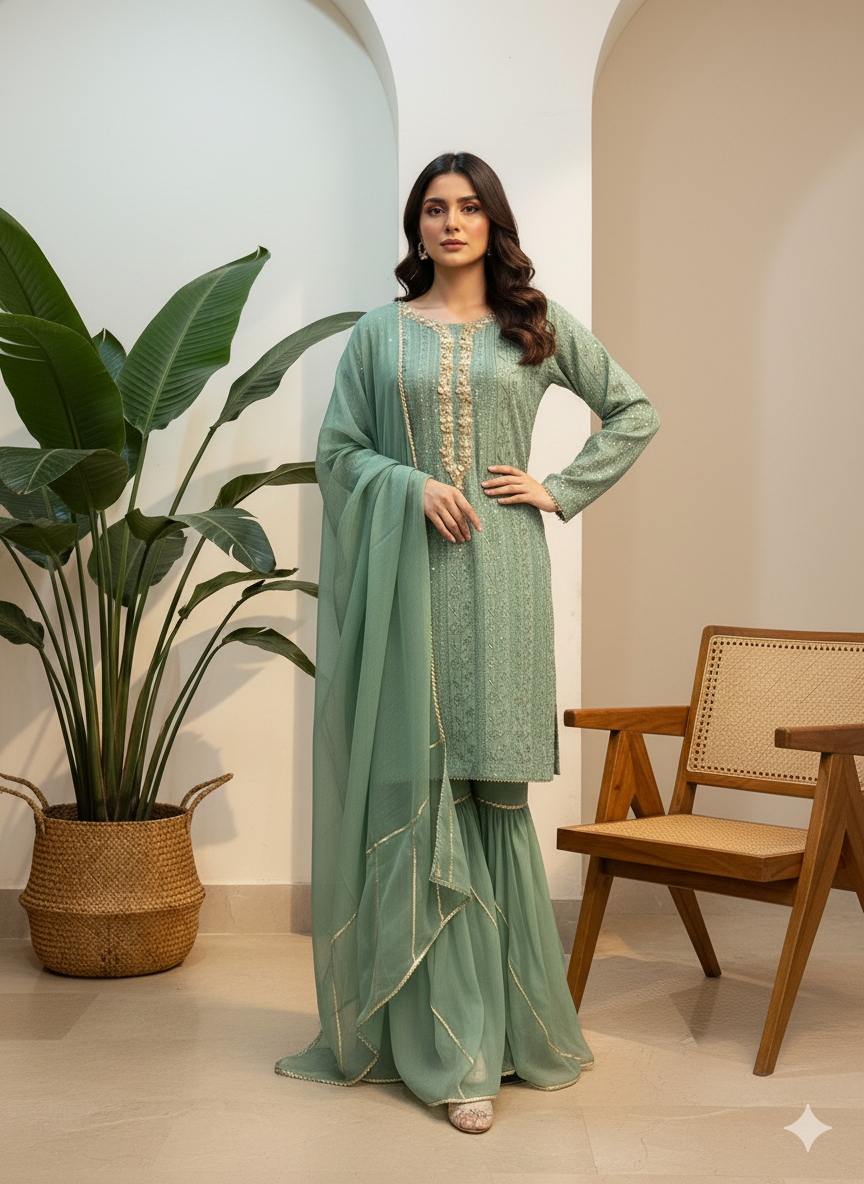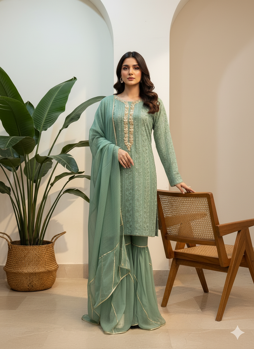 Chiffon fabric,chicken Kari with sequence embroidery work,Neck hand made with dapka and gota work beautiful embellishment. Garara and duppata gota work used.