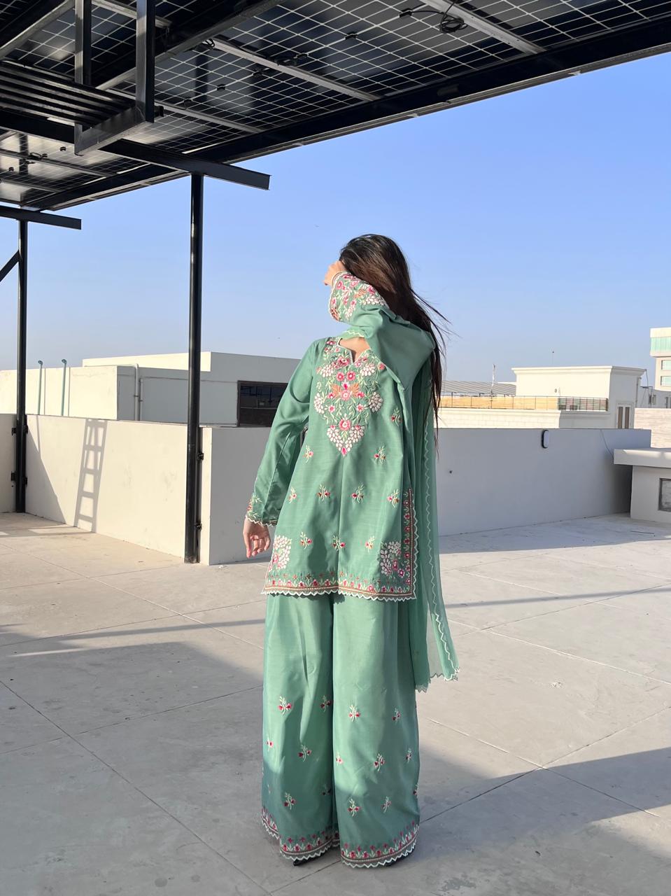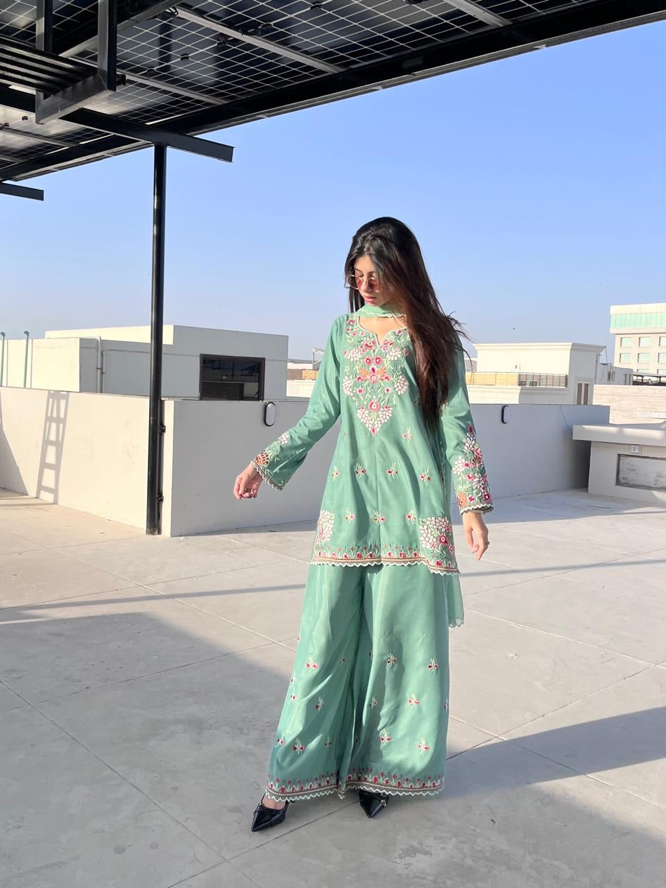 Fabric:Raw silk thread work embroidered,duppata chiffon fully embroidered.