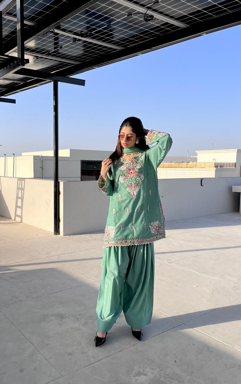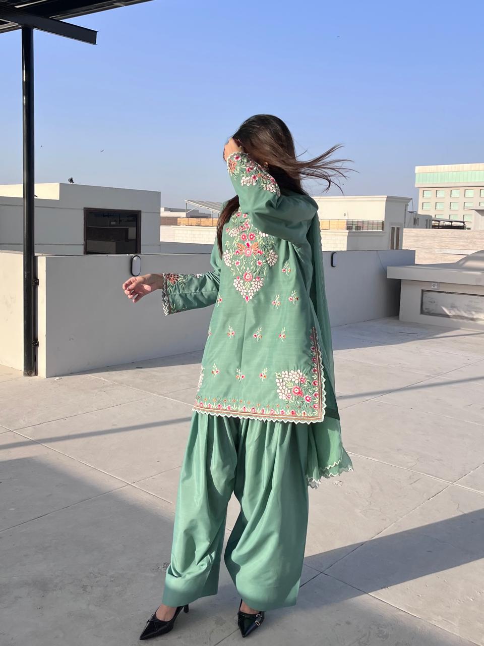 Raw silk fabric:Thread work embroidery with traditional farshi shalwar