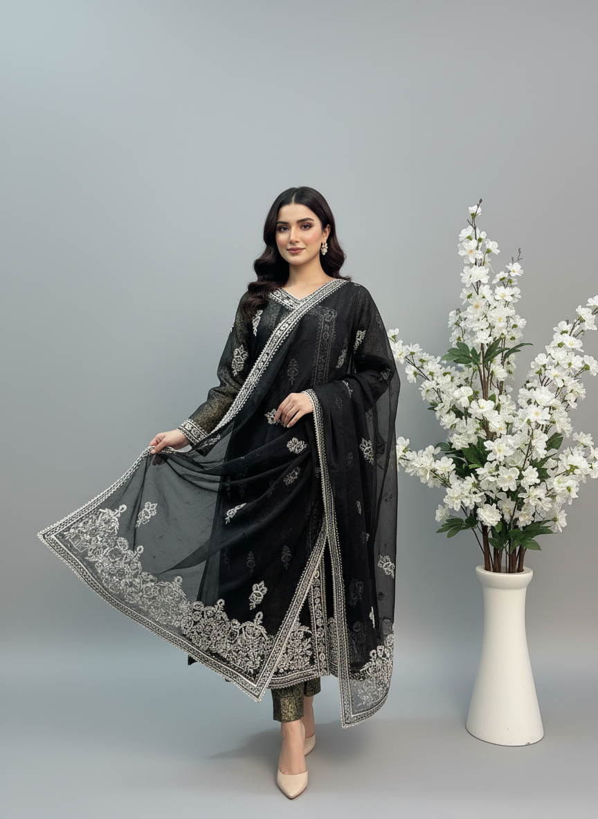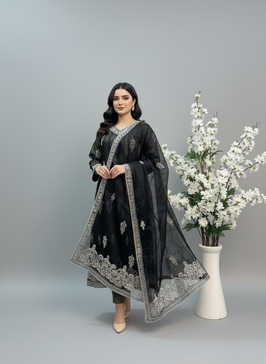 The dupatta is also made of organza and is fully embroidered, adding elegance and sophistication to the look. The inner and trouser are tailored from high-quality jamawar fabric, ensuring comfort with a rich, traditional finish.