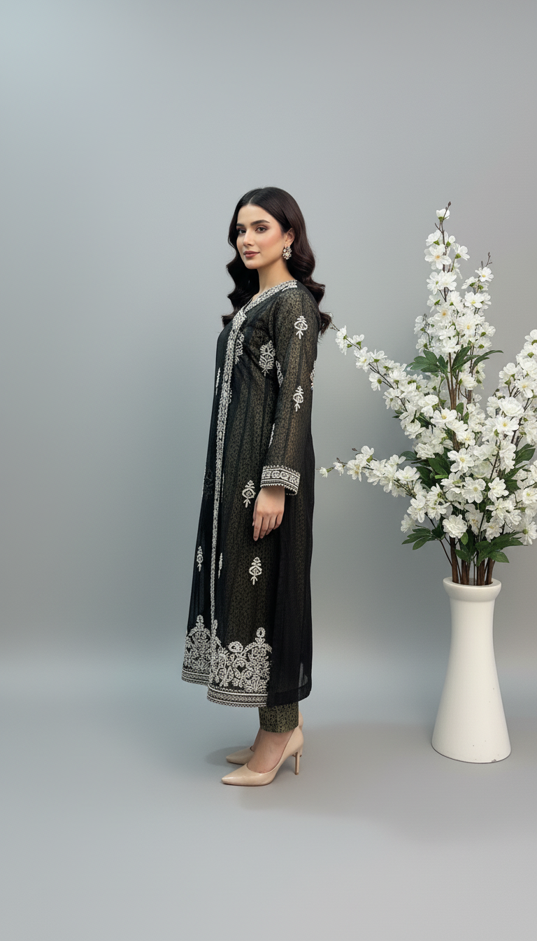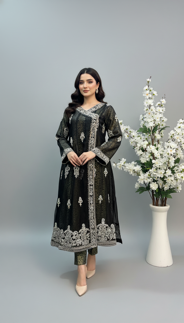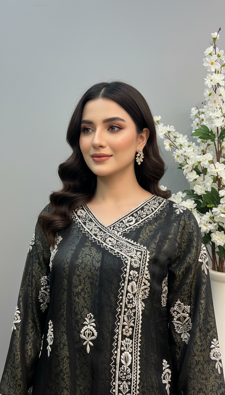 This stunning outfit is made from premium organza fabric featuring self embroidery and handcrafted thread work. The design includes intricate embellishments using kapka, pearls, sitara, and other delicate materials that enhance its luxurious appeal.