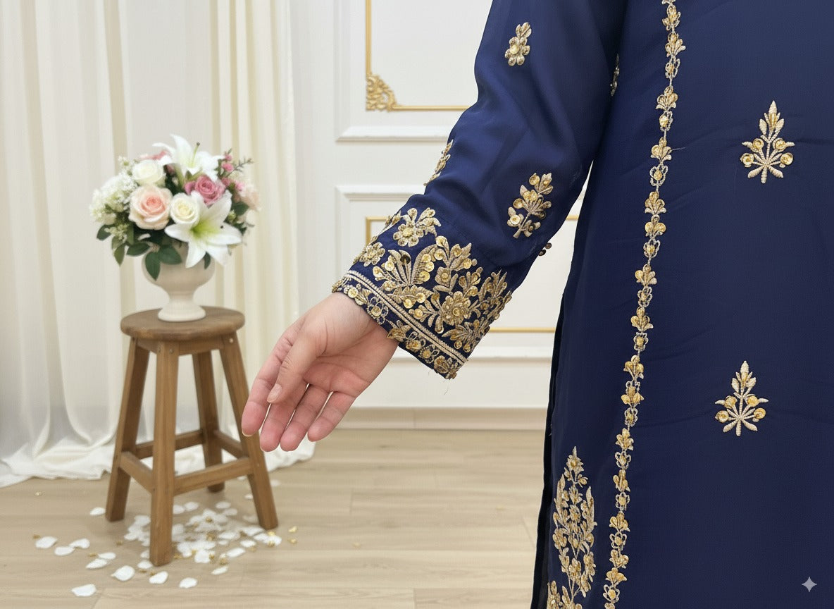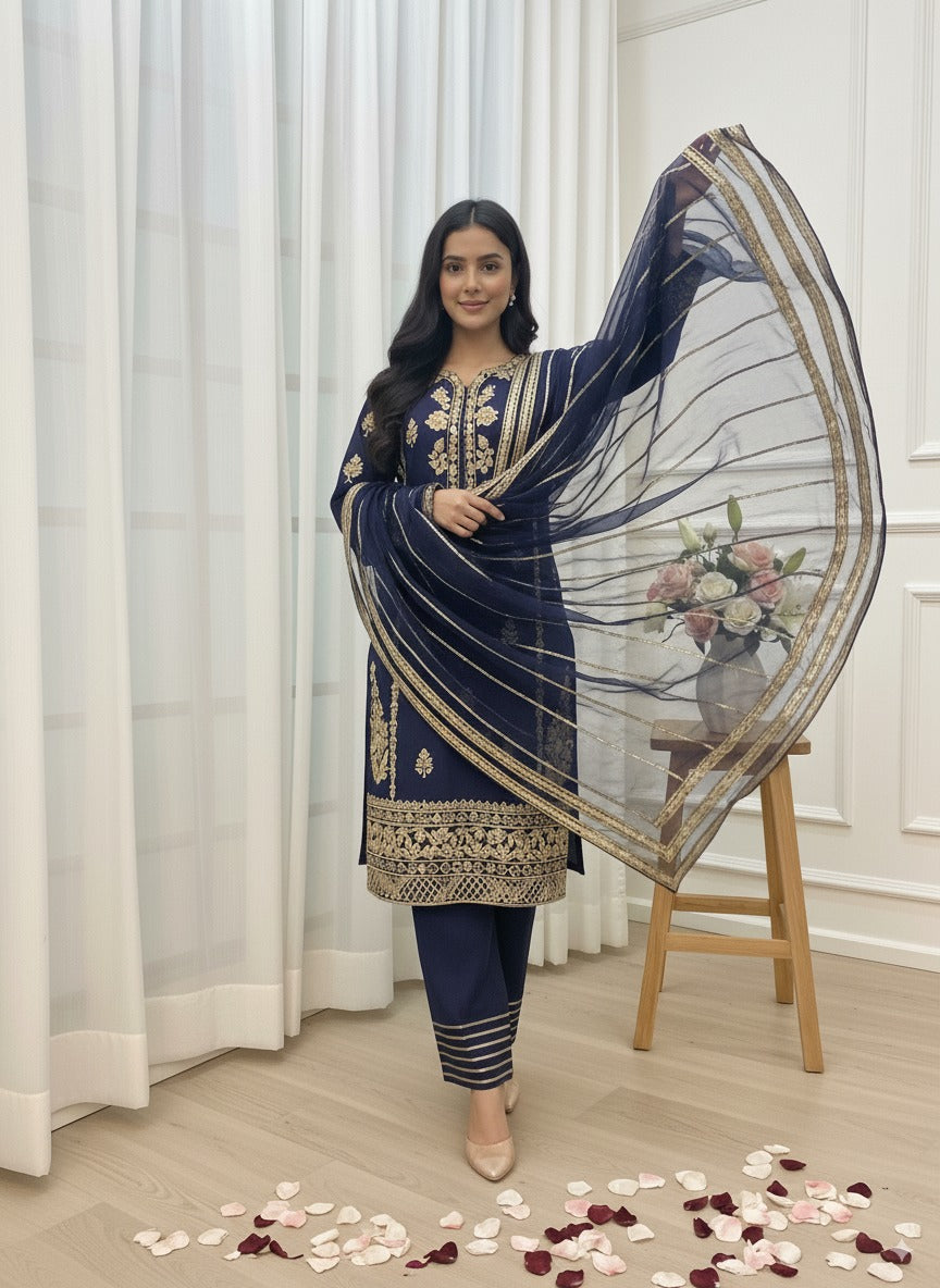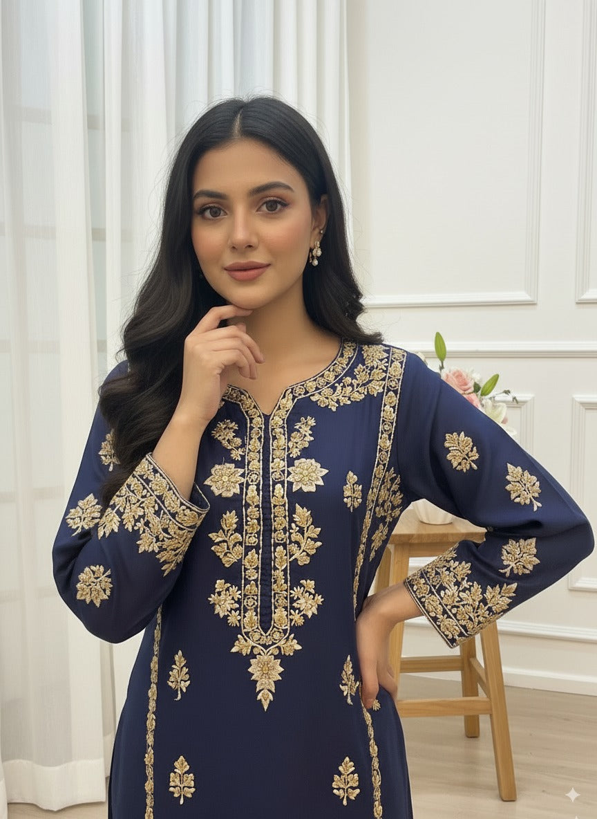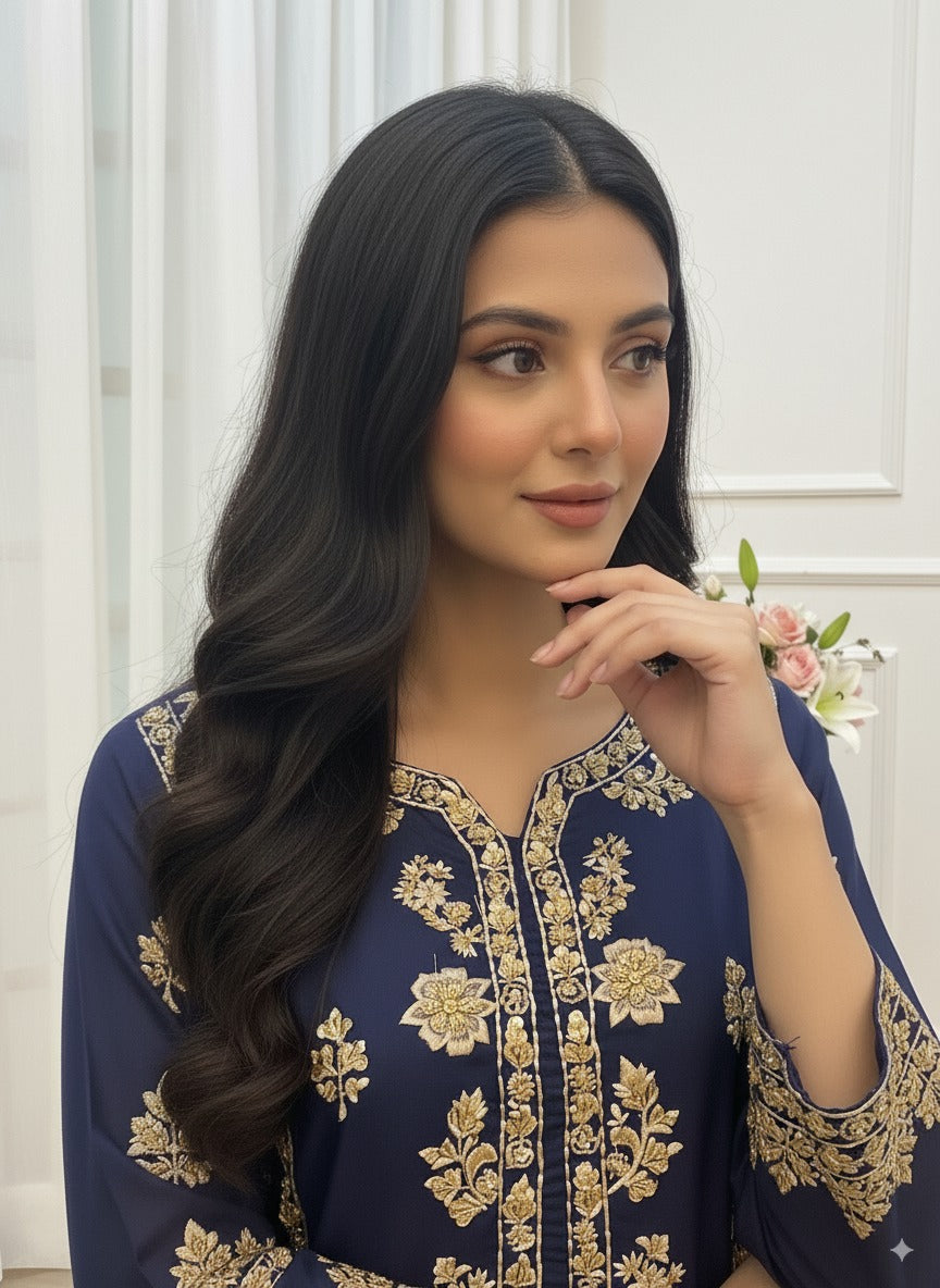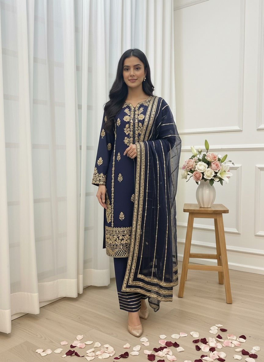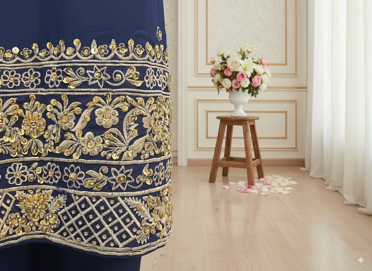 Fabric Description:Fabric raw silk Duppata organza,work thread with Hand made like dapka,moti,sitara,cut dana etc used.Exclusive party wear in different Color’s.Like black,navy blue,maroon,bottle green,white ,purple and teal.