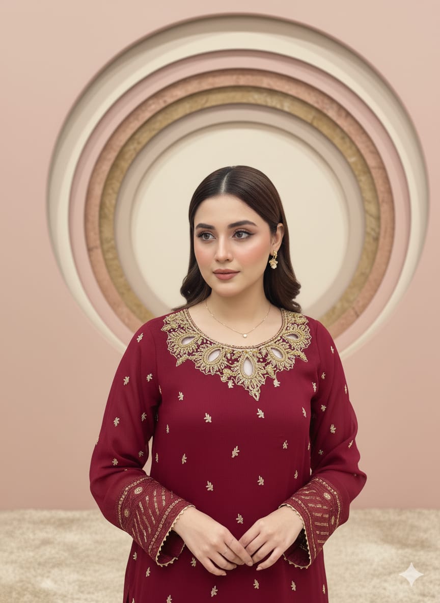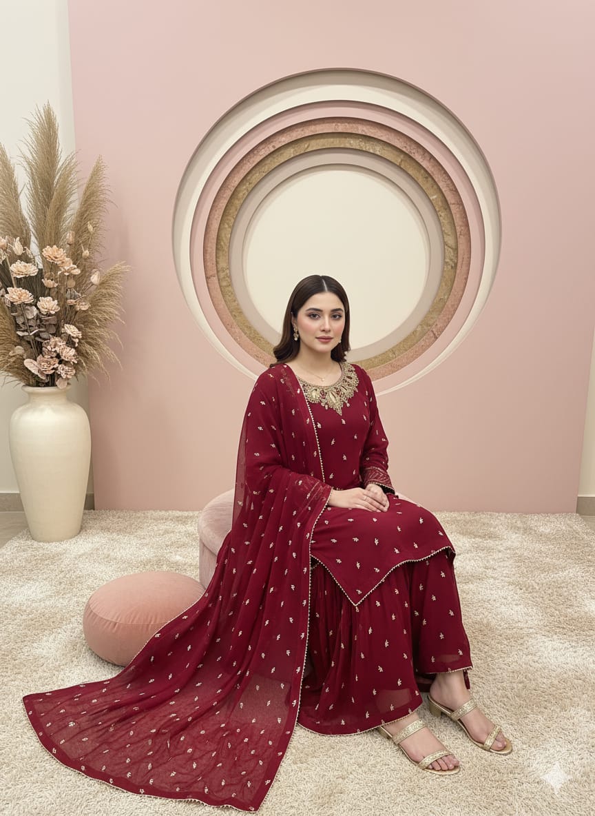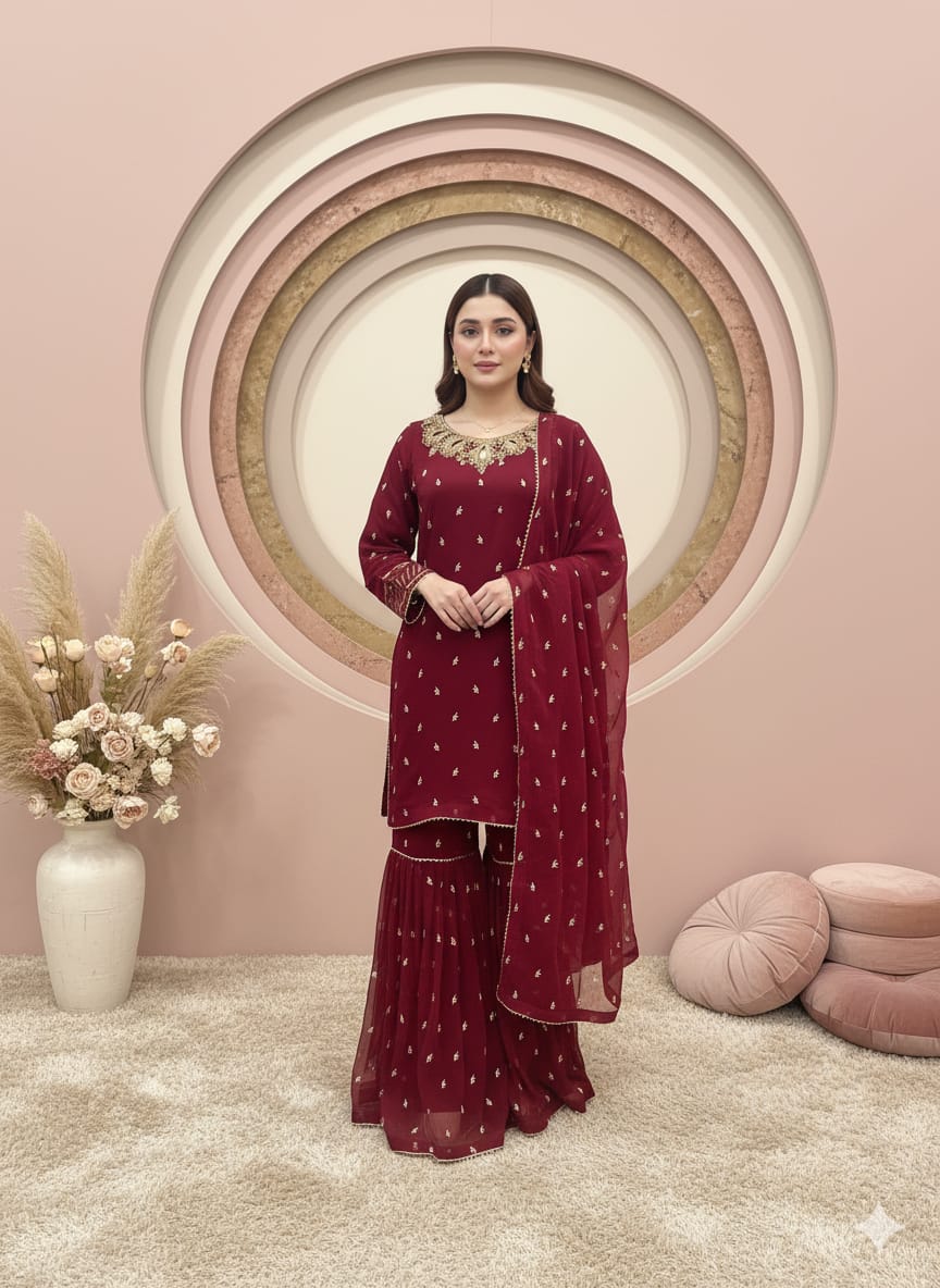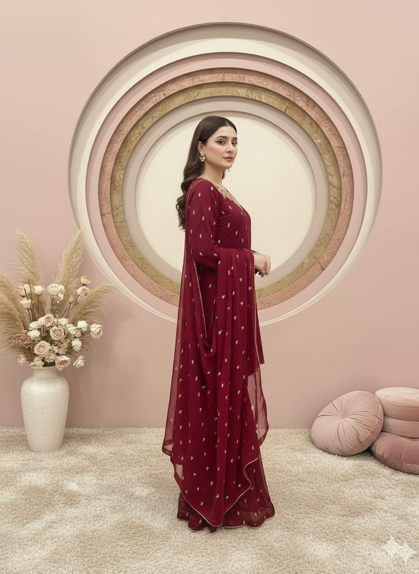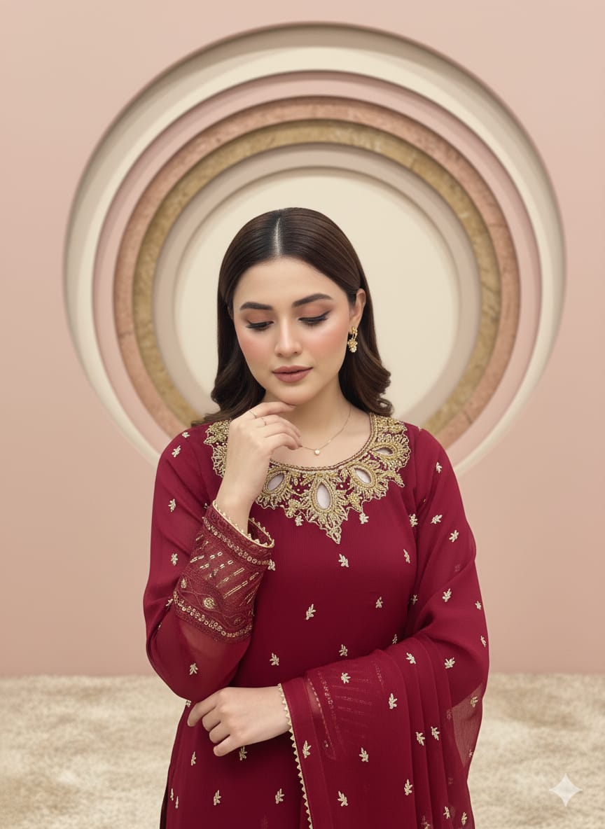 Fabric:Chiffon embroidery zari work neck hand work dapka,moti and peals used.border Embroidery on sleeves,finished with somosa lace and finish fabric also used.