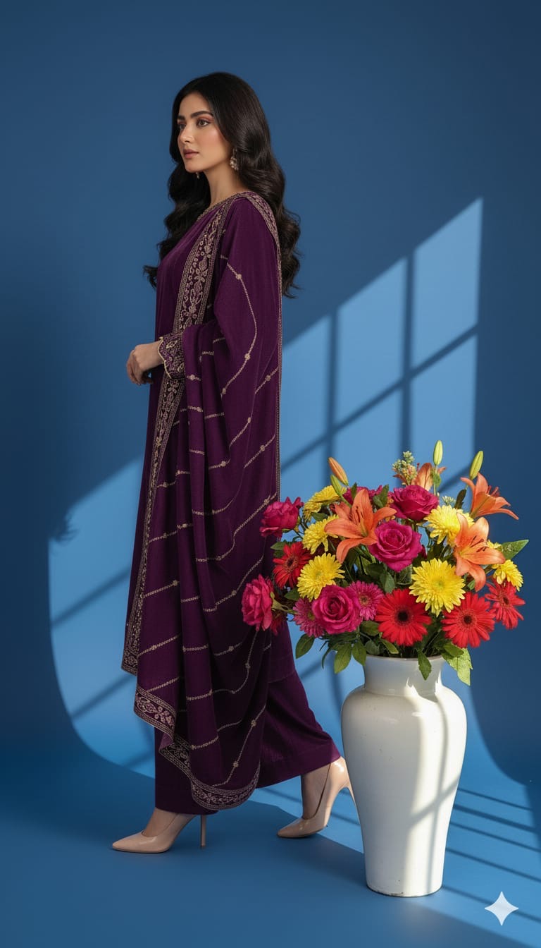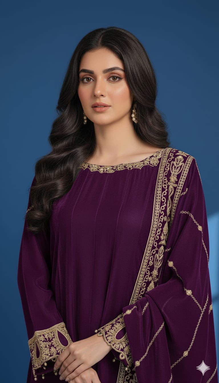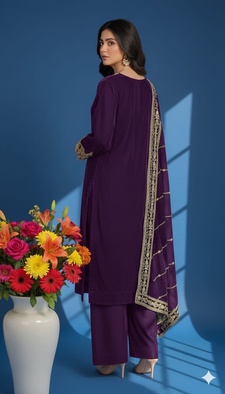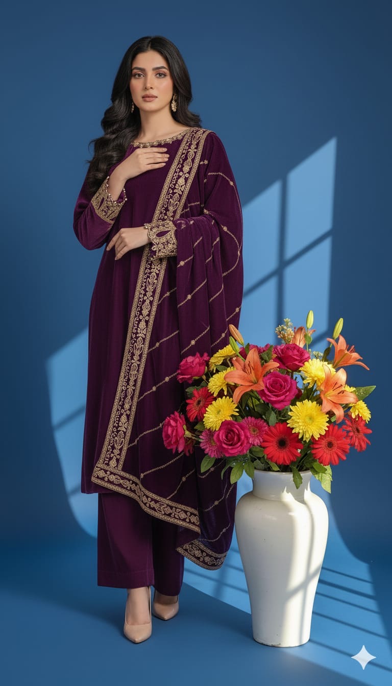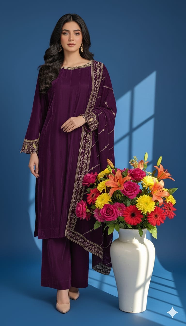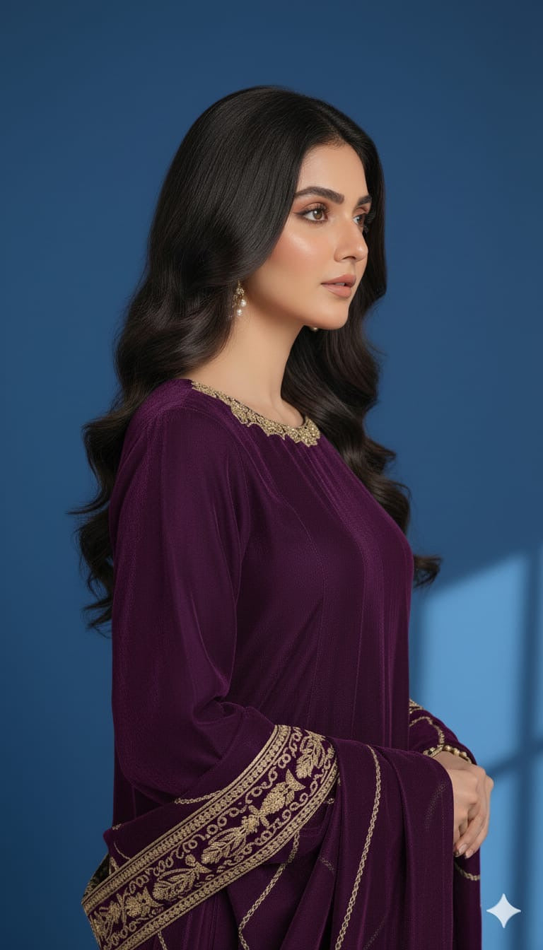 Fabric:velvet 9000 mirco velvet,hand made on neck and sleeves,shawal also in velvet and embroidered zari work 4sides jamavar d.p finished and along dhaka in velvet.Perfect outfit for winters wedding or party.