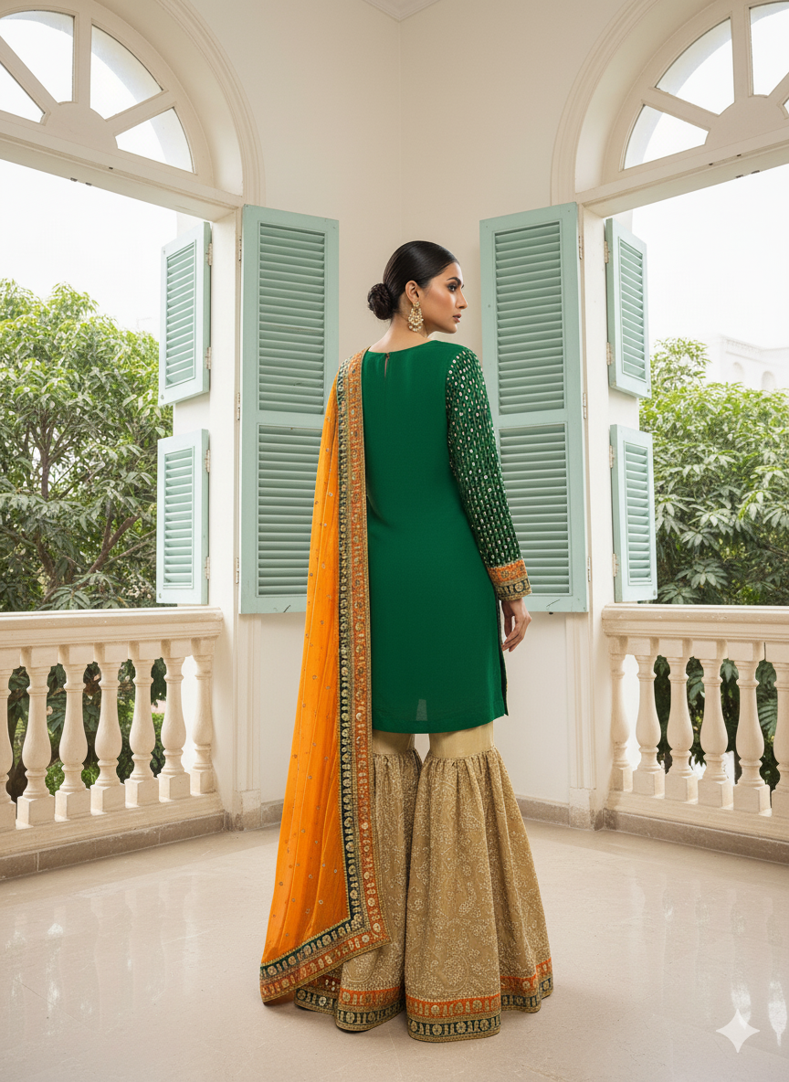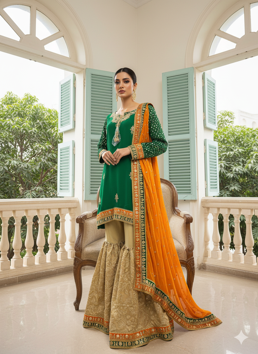 The garara is crafted from fine chiffon with detailed embroidered thread work and gota embellishments on the bottom, finished with original Indian laces.