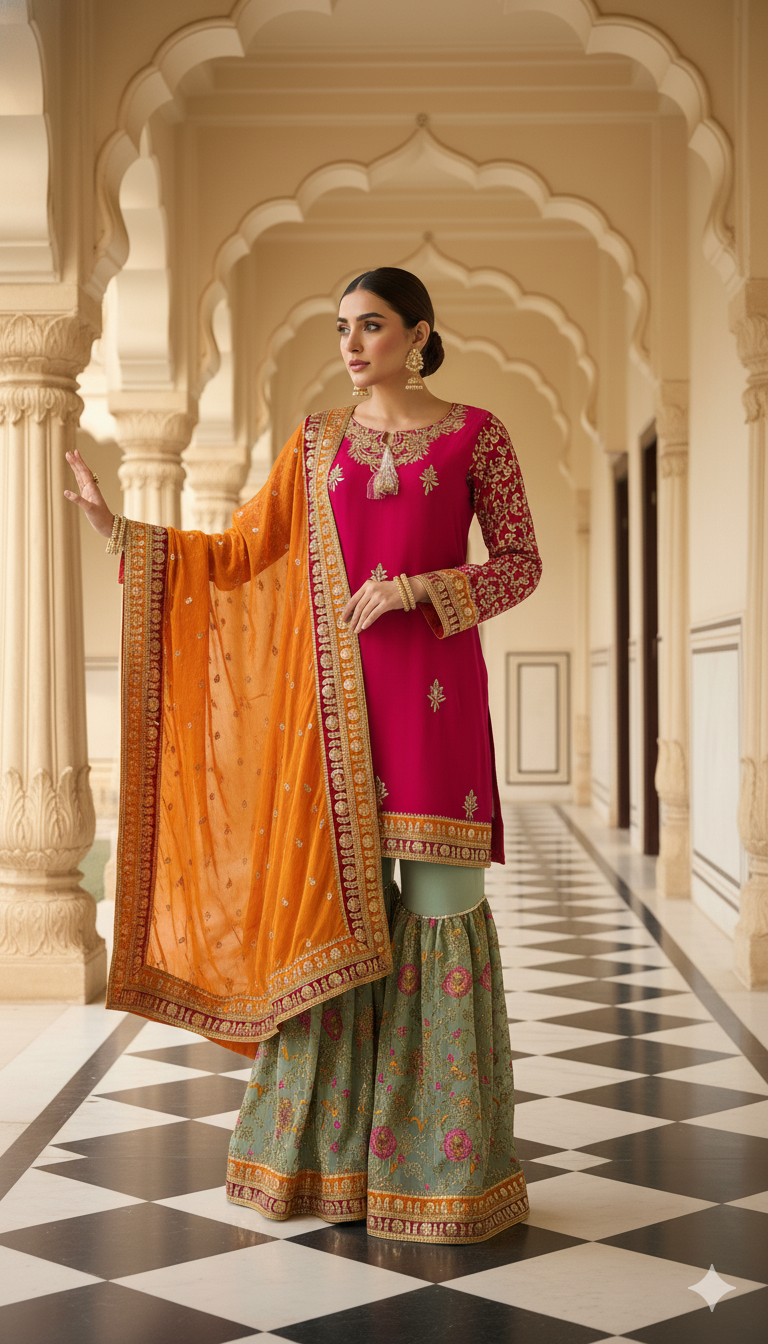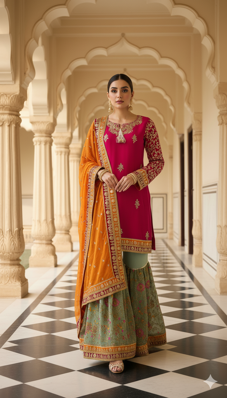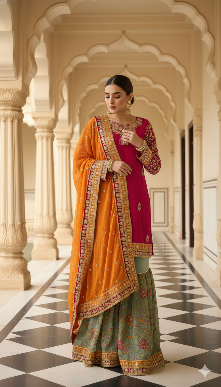 The garara is crafted from fine chiffon with detailed embroidered thread work and gota embellishments on the bottom, finished with original Indian laces.