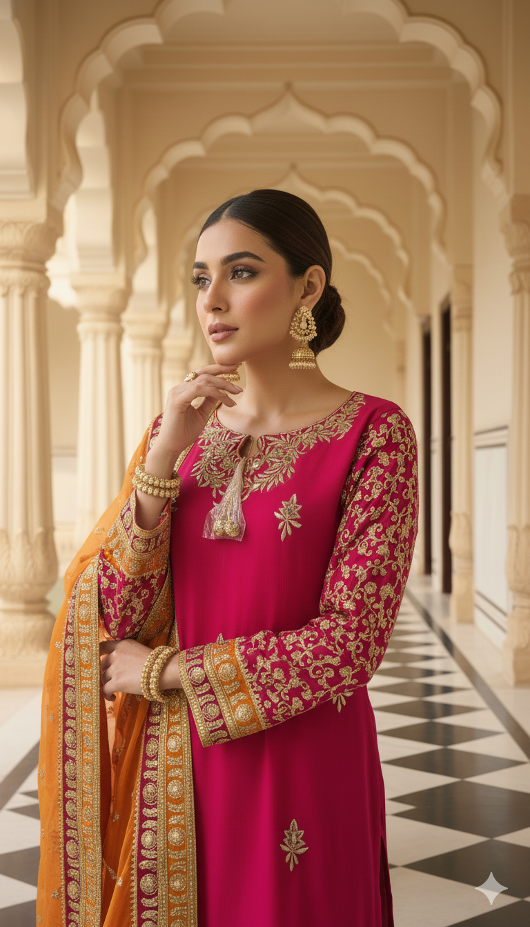 This beautiful outfit features a matchine embroidered zari with mirror work.