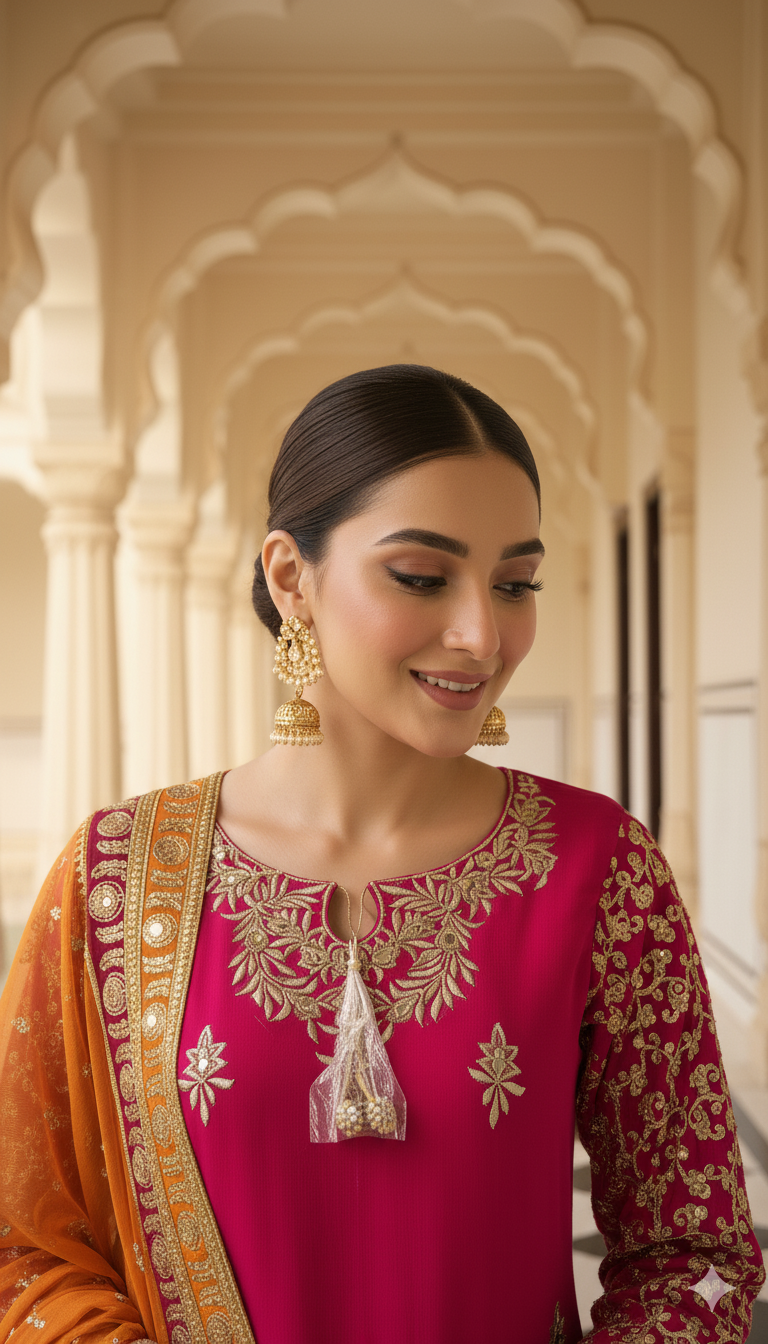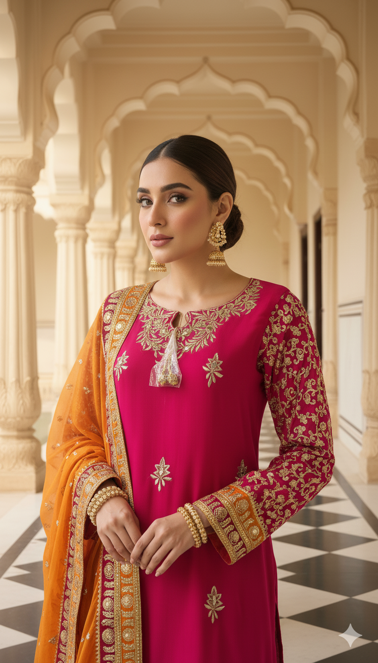 The dupatta is also made of chiffon, showcasing zari embroidery and bordered on all four sides with Indian laces, giving it an elegant traditional touch.