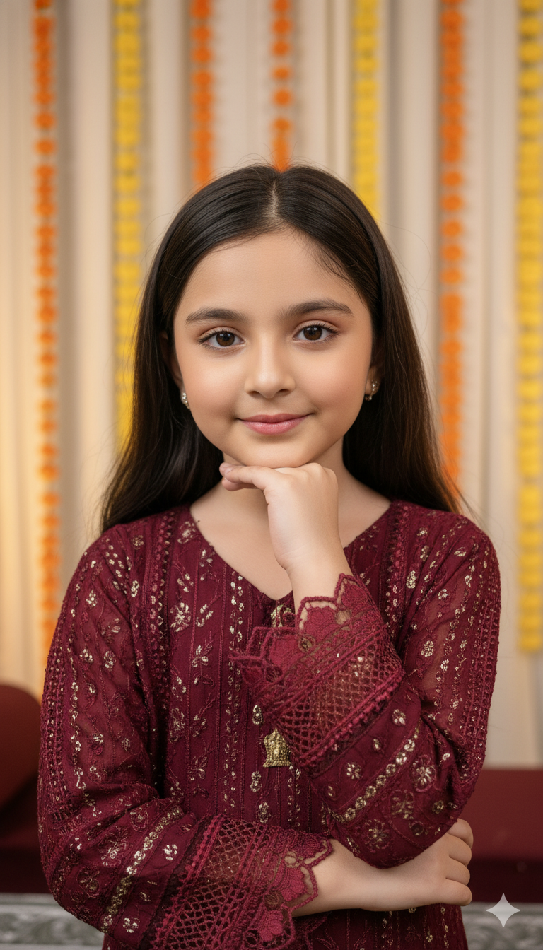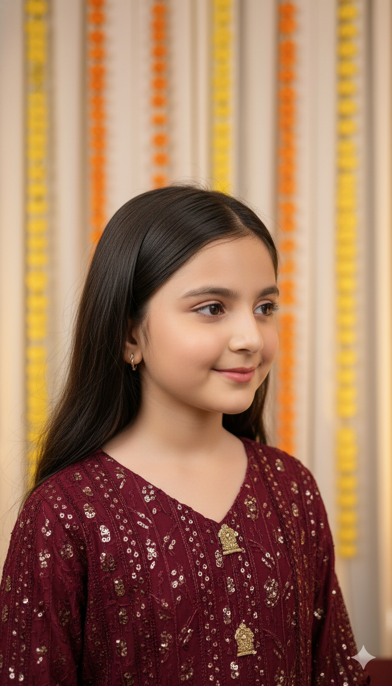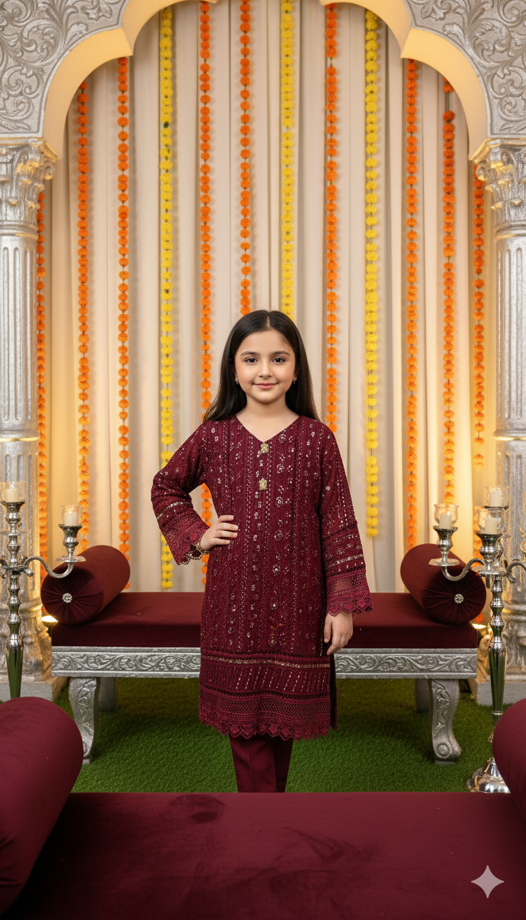 Elegant chiffon fabric with sequin and thread embroidery work. This beautifully crafted shirt comes with matching trousers, making it an ideal choice for weddings or party wear. Designed especially for kids, combining comfort with festive style.